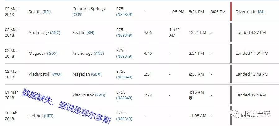 在广大吃瓜群众的关注之下,这架注册号为N89349,隶属于美联航支线合作伙伴Mesa航空的ERJ-175LR自2月23日从美国德州休斯顿IAH历经 6 次经停,最终在大概2月28日,也就是4天多之后(包括人员休息),抵达了中国的呼和浩特机场。总计里程7721英里(12426 公里)