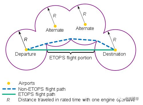 接下来该说说ETOPS了,对于从西海岸飞往夏威夷的航班,由于中途没有任何机场可以用来备降,因此必须获得ETOPS认证。ETOPS是Extended Operations两个单词的缩写,正式全称是Extended Range Operation with Two-Engine Airplanes,中文叫做“双发动机延程操作标准”。在航空届内部,ETOPS也经常被戏称为Engines Turn Or Passengers Swim”(发动机要转动,否则乘客就得游泳)。 ETOPS容许双发动机飞机如波音737、757、767、777、787、空客A300、A310、A320、A330、A350作长距离飞行(尤其是穿越沙漠、海洋和极地的航线)。ETOPS订立前,双发动机飞机都不能执行这一类航班。而维基百科上的一张图示也说明了从飞行路线而言,ETOPS标准的改变了客运航空业: