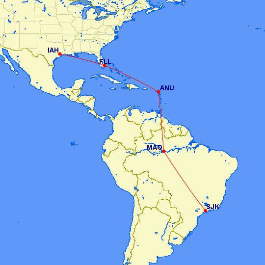 飞机从巴航工业位于São José dos Campos(SJK)的工厂起飞后,途径亚马逊丛林门户玛瑙斯(MAO),加勒比海中的岛国安提瓜(ANU),及佛罗里达州的劳德代尔堡(FLL)三次经停,最终抵达休斯顿(IAH),全程距离达到5369英里(约8640公里)。但是这个距离远远比不上从呼和浩特一路飞向休斯顿的7718英里(约12421公里):