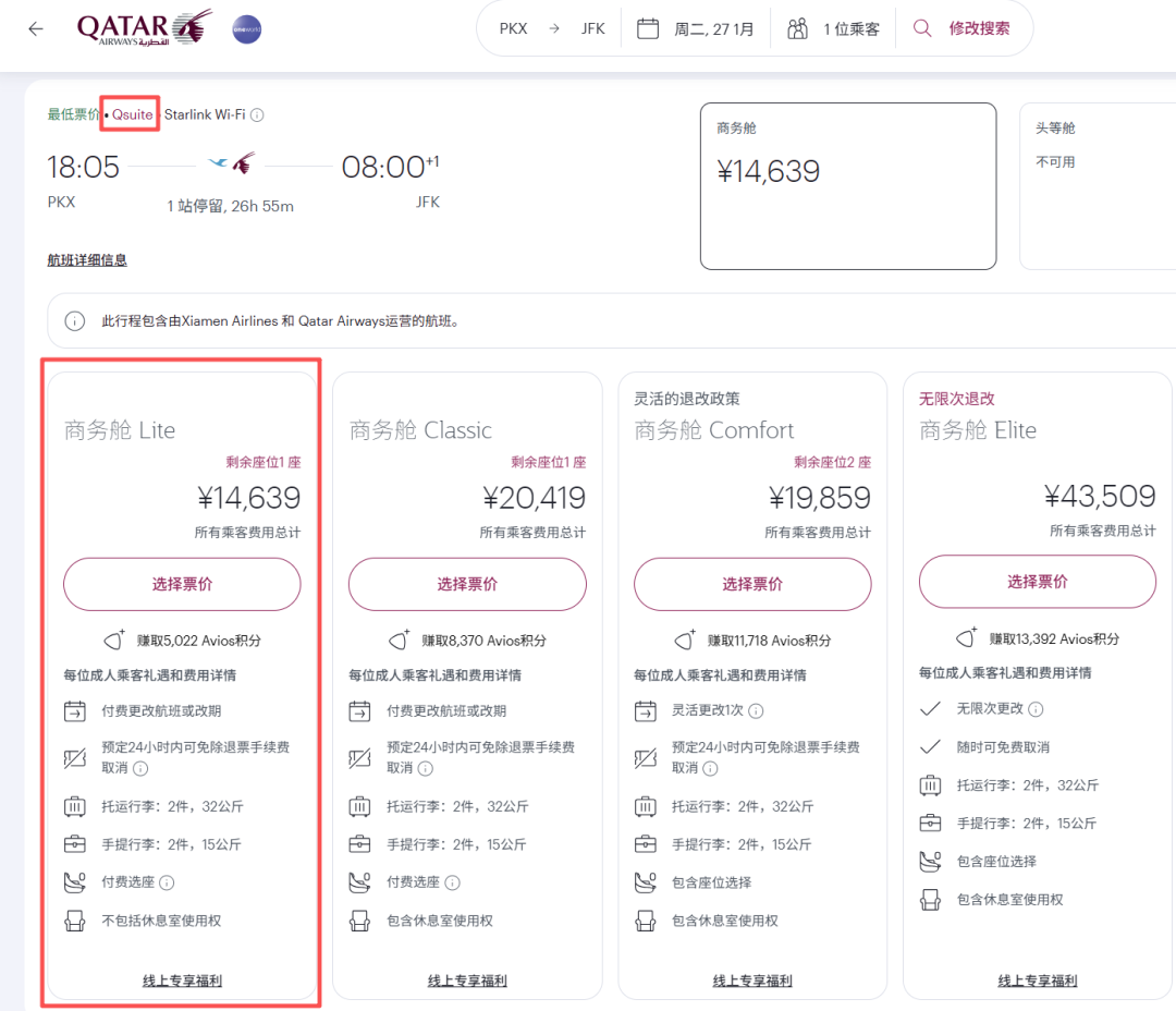 北京-多哈段可选择厦门航空