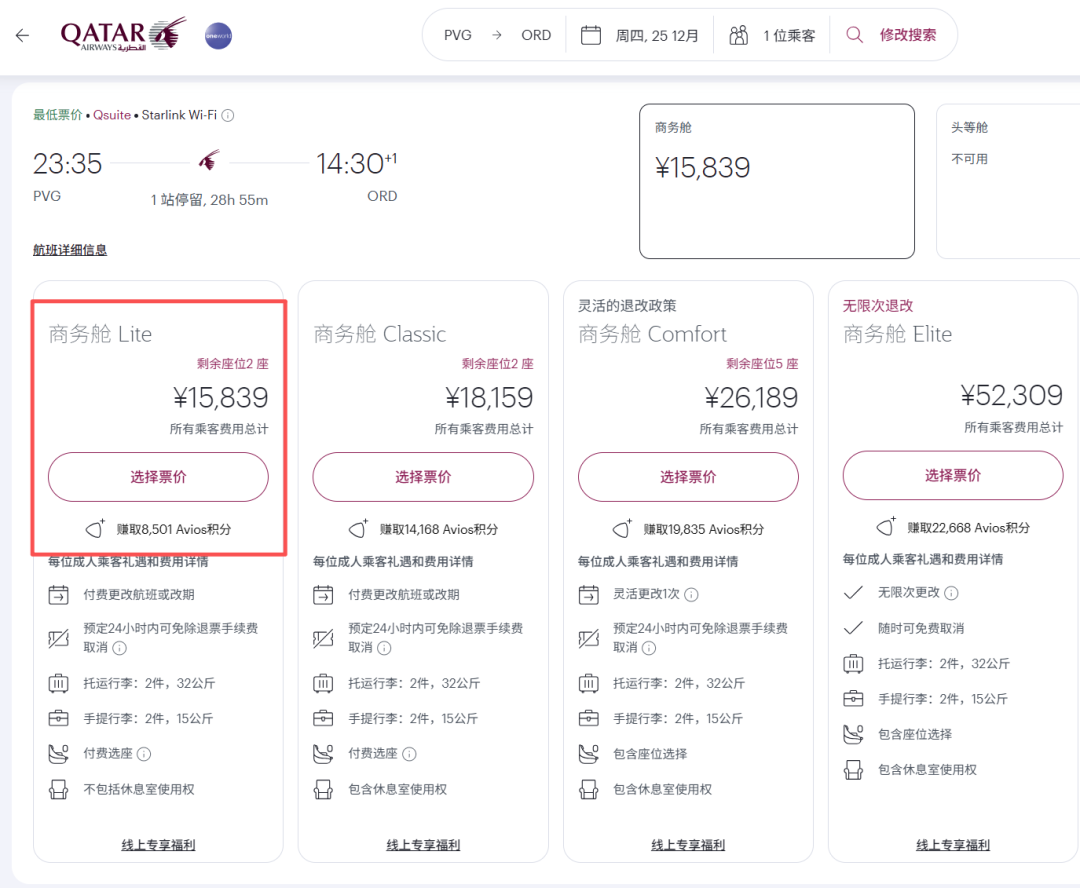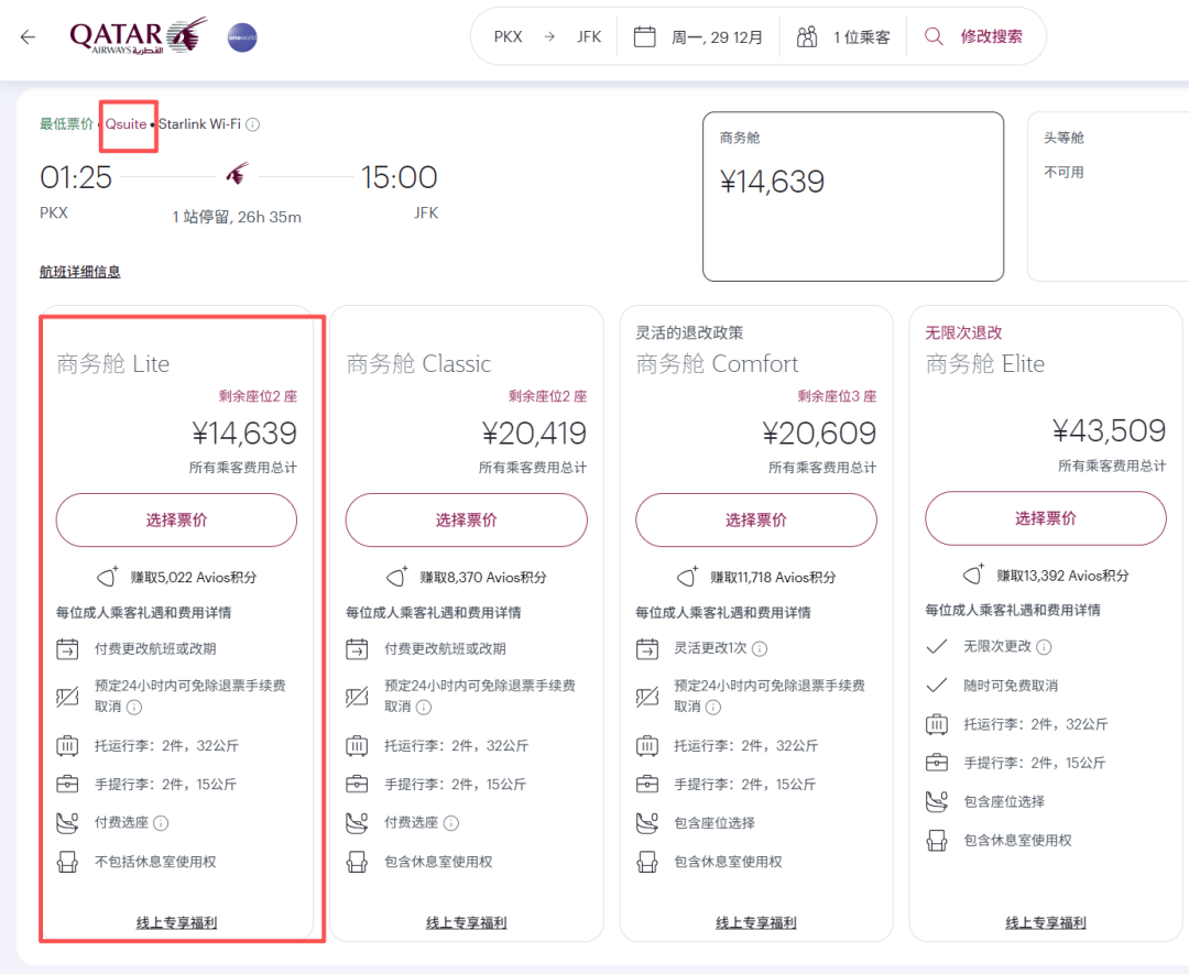 lite商务舱 QR – P舱 (无休息室使用权)