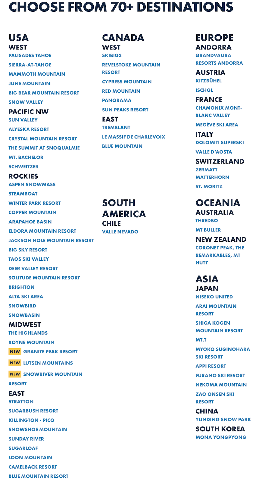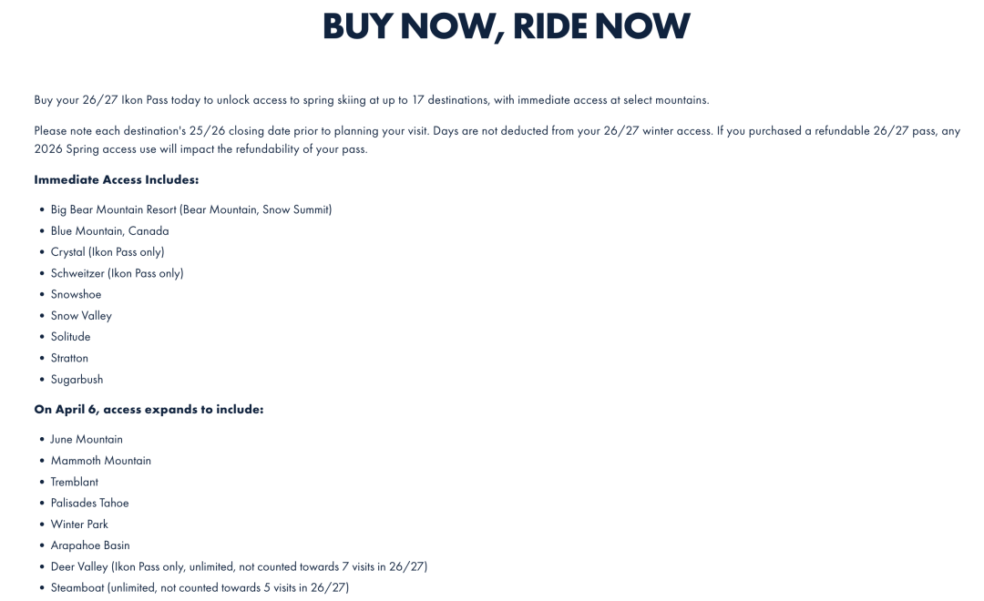Ikon Pass和Ikon Base Pass 购卡后可以从3/12日起在以下雪场无限畅滑 (不包含Ikon Session Pass)