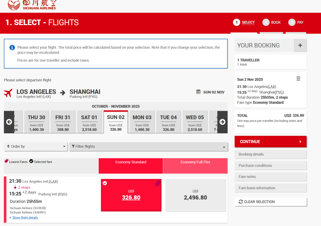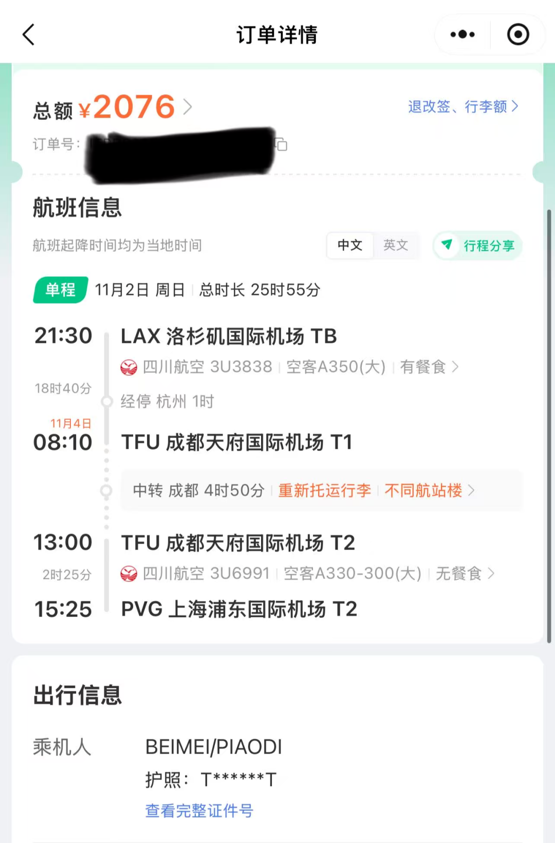 四川航空3U3838航班,10月26日之后,洛杉矶-成都航班需要经停杭州~