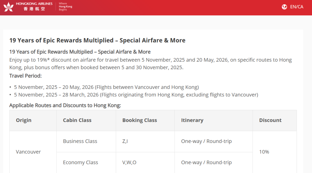 加拿大飞香港:2026年1月10日-5月24日或8月15日-10月24日