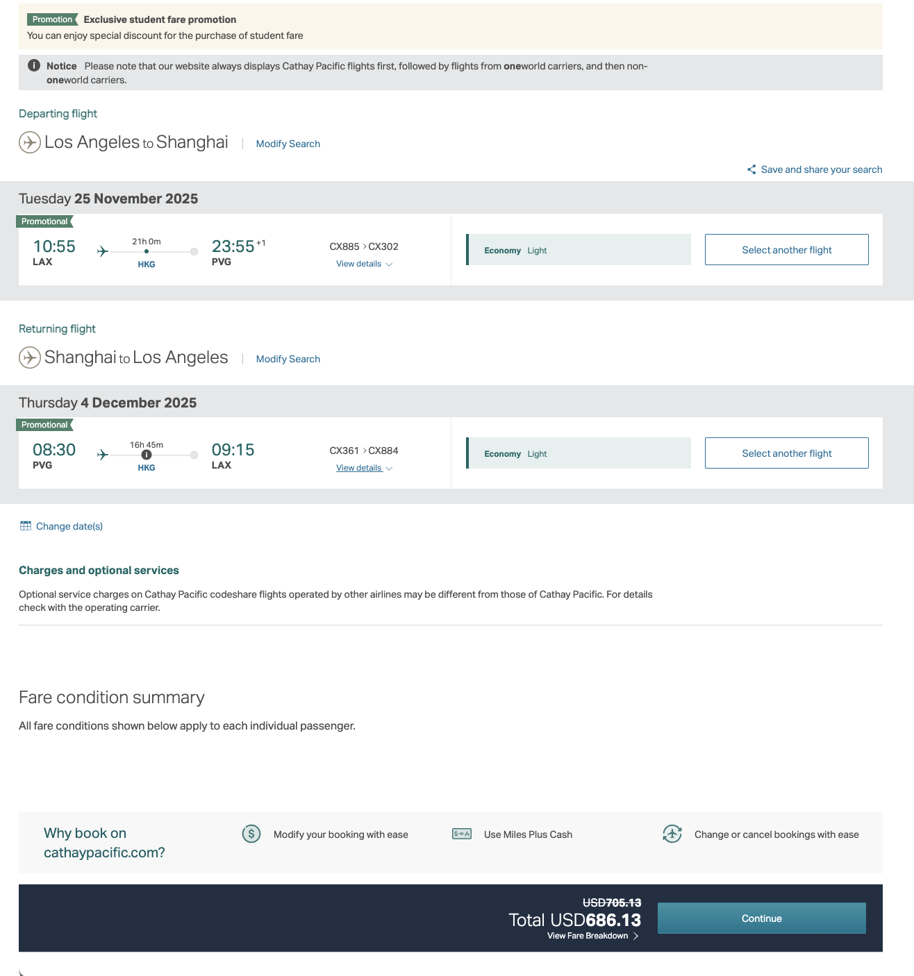 感恩节,洛杉矶-香港-上海,686美金(学生优惠前705美金)