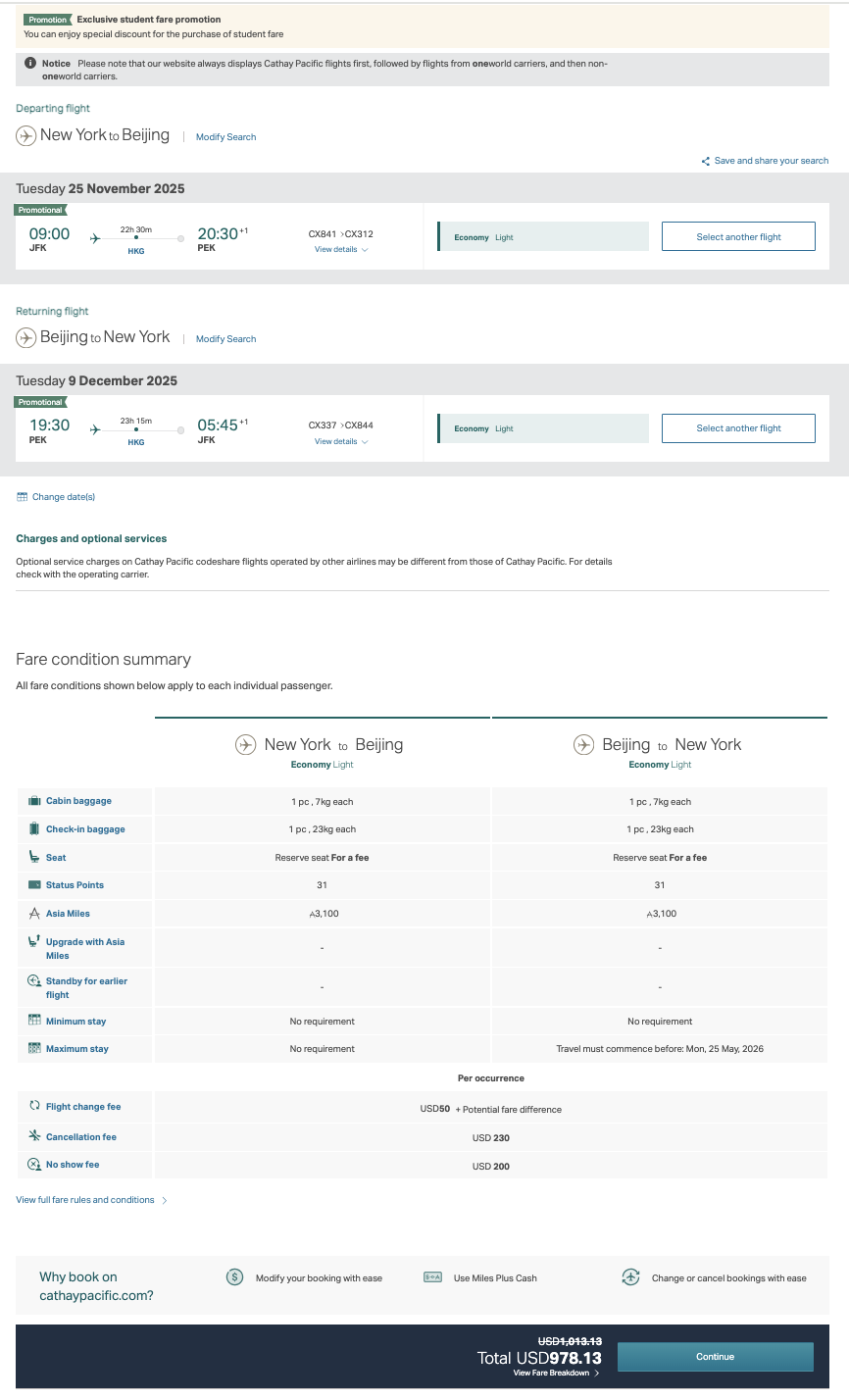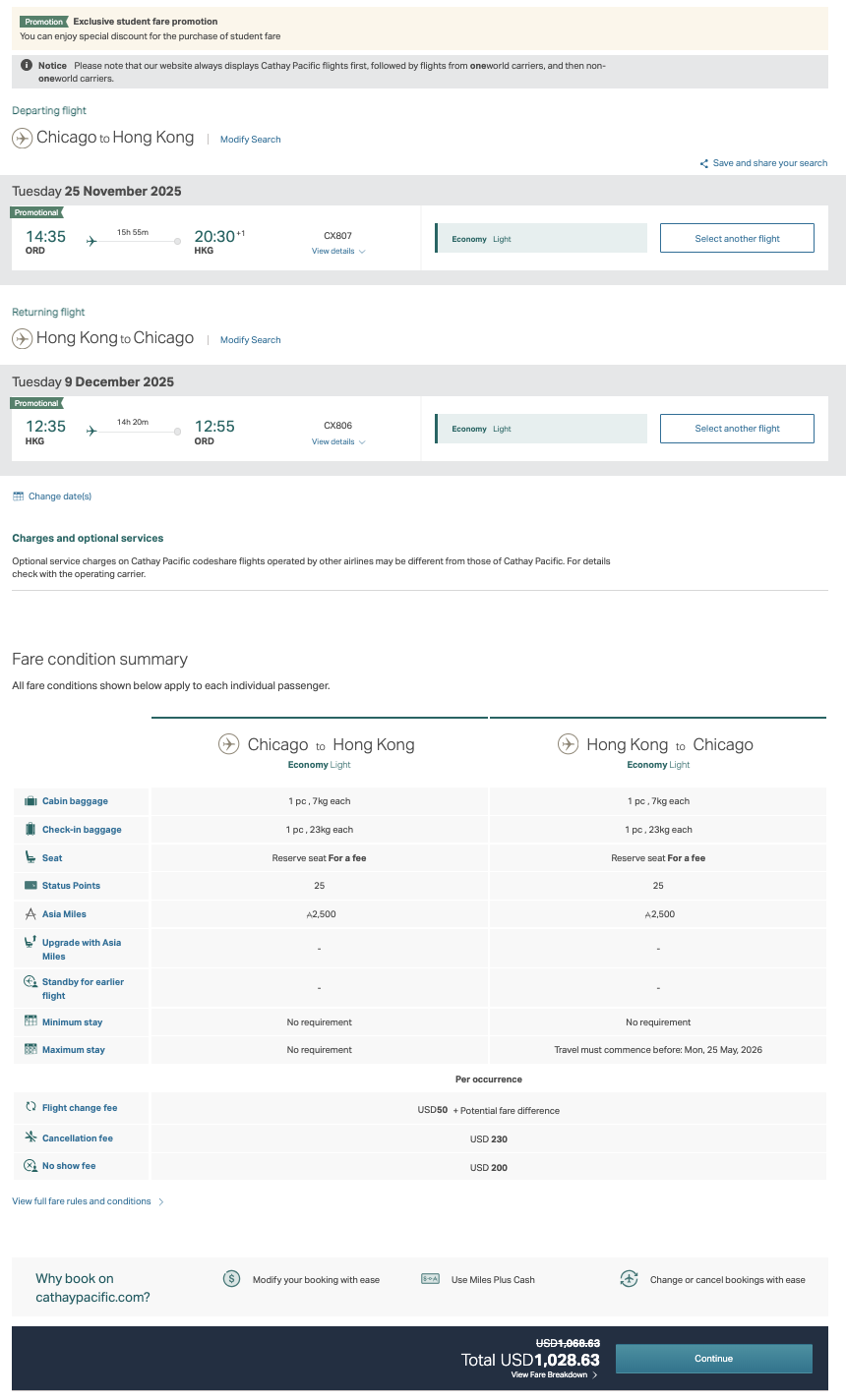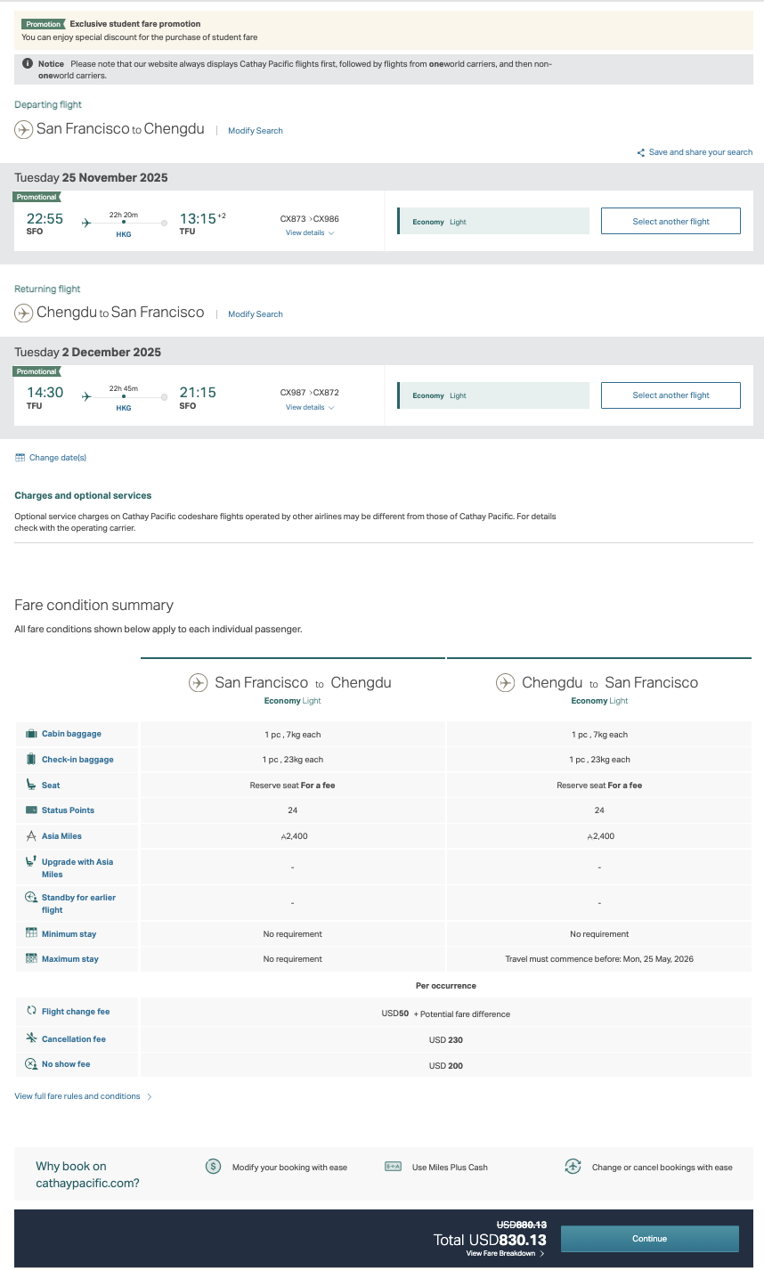 价格不错,日期很多,覆盖很多很多航点,以至于基本可以从美国家门口一转飞中国家门口,很多时候一天还有多个航班选择。如果是大湾区的同学,还可以直接转船从香港机场到家门口,很多情况不仅不用额外买船票,还能让机票比直飞香港的更便宜。