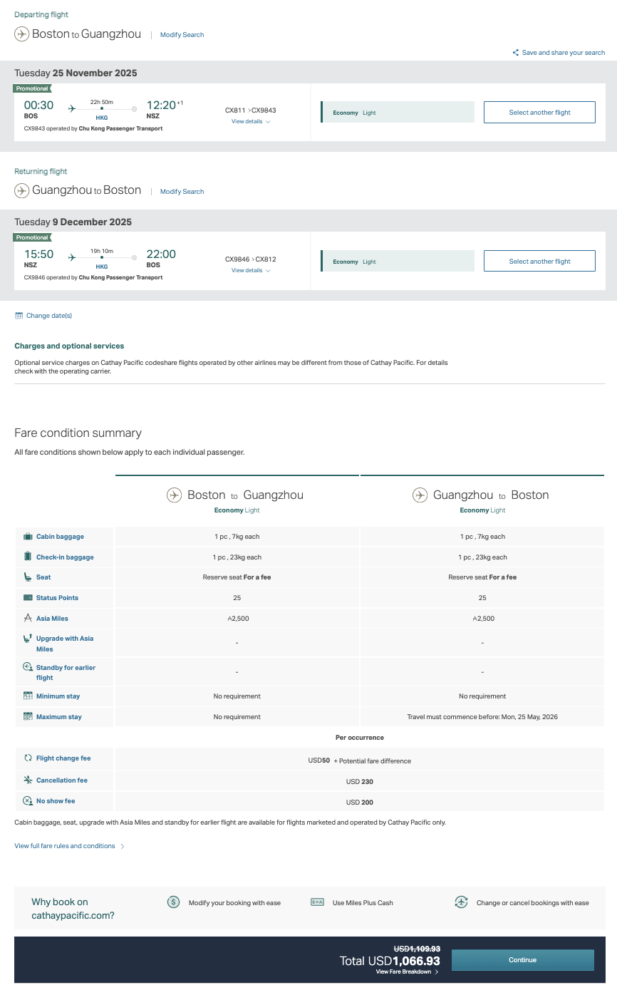 波士顿直飞往返香港,接续到广州南沙港的船比单买直飞更便宜: