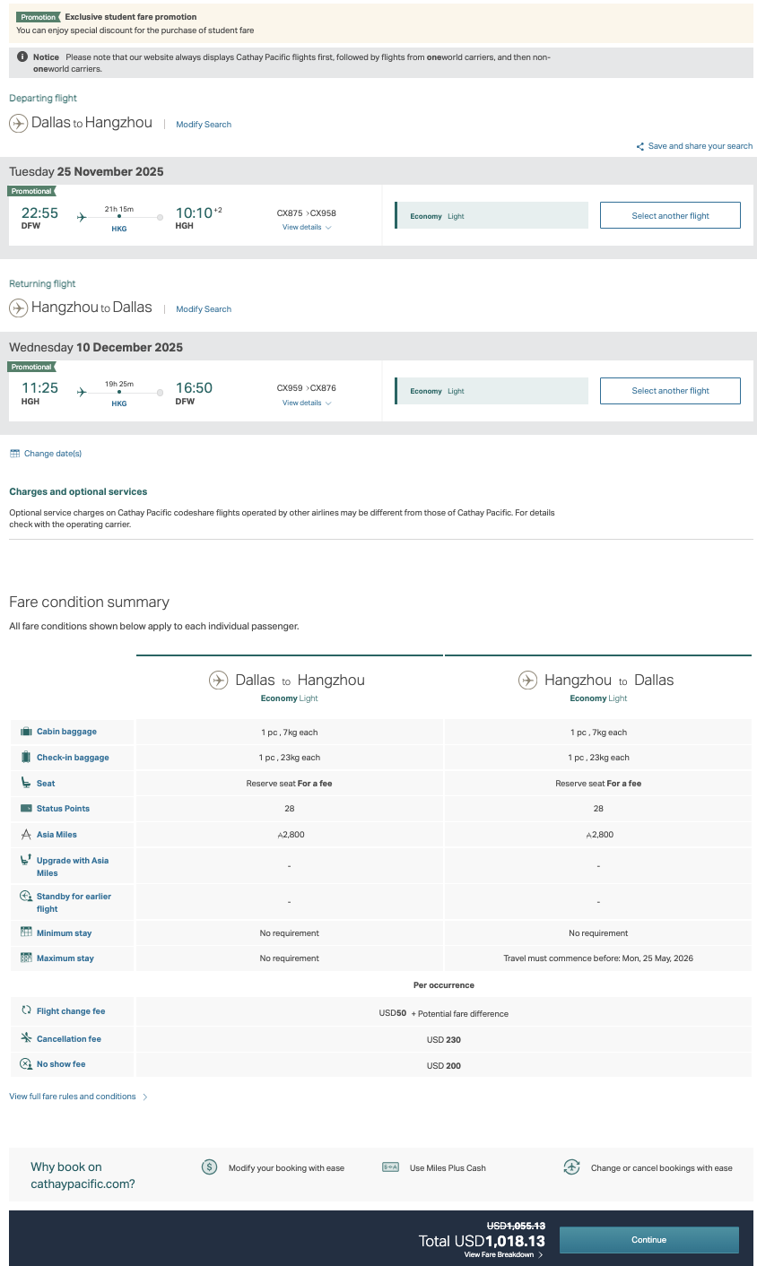 达拉斯-杭州往返,1018美金,类似这种“小众”组合的路线很多: