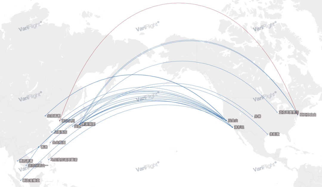 (使用飞常准绘制的美联航跨太平洋航线)