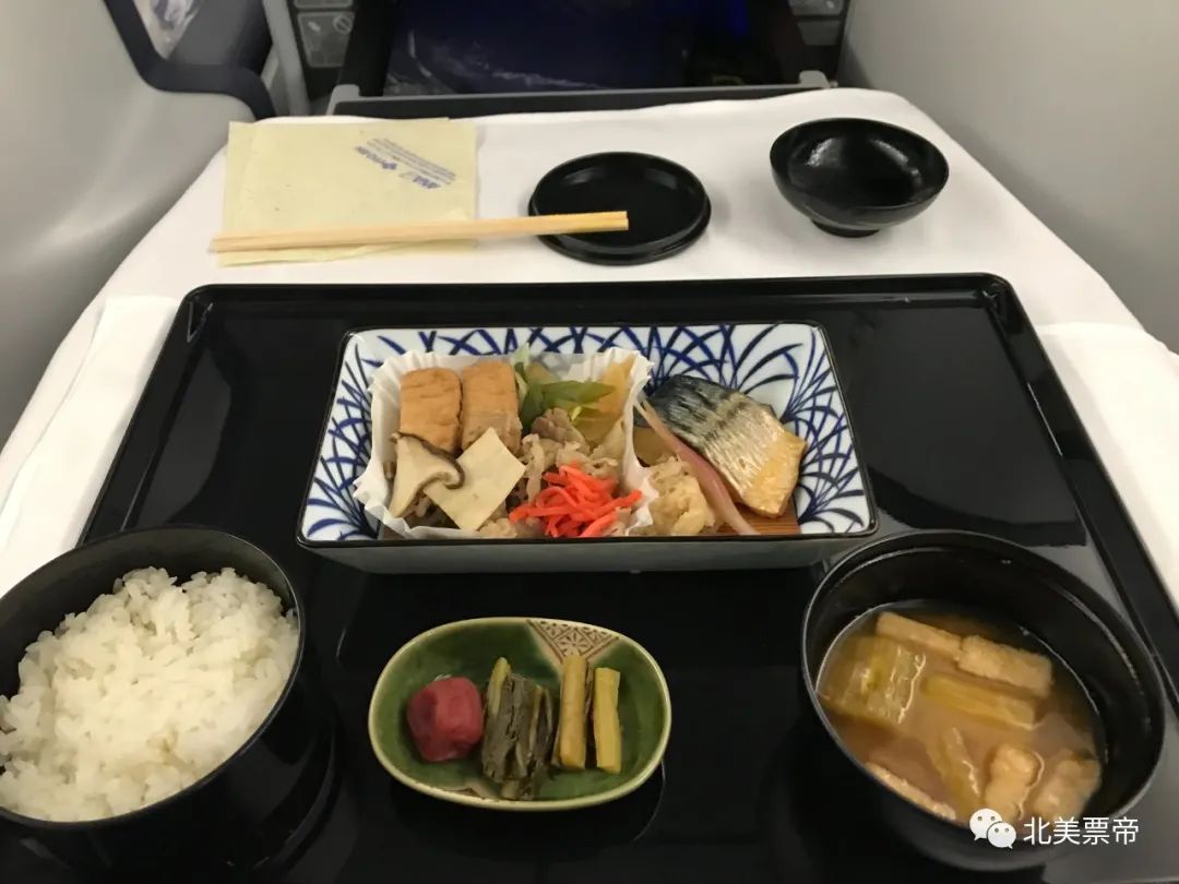飞机平飞之后,我点好自己想要的套餐。不一会儿,丰盛的晚餐就一道一道地呈了上来。考虑到在美国吃日料会有点小贵,我点了日式的飞机餐。有开胃菜、小菜、主菜、米饭以及甜点。在结束用餐后空乘人员发放了入境海关申报卡。在大约日本时间晚上9点之后到降落前两小时这段时间,机组调暗了客舱内的灯光,我愉快的进入了梦乡。