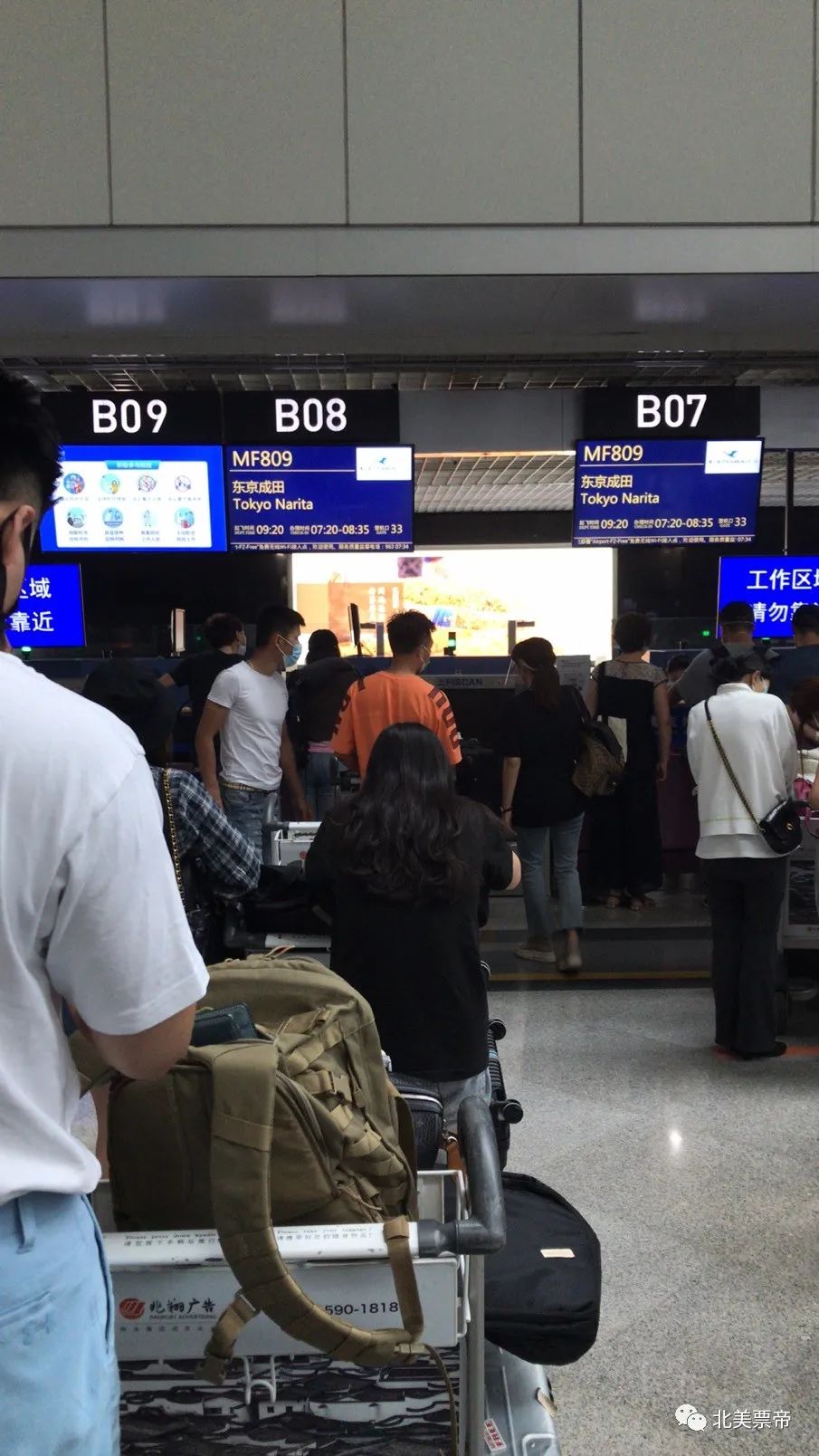 大约7:20分,我来到了位于国际出发大厅的值机柜台处排队。MF809航班似乎是当天清早在福州出港的唯一国际航班。执飞这个航班的机型是波音737-800,因此这里并没有像浦东机场那样排很长的队。排队的第一步是扫描海关旅客指尖小程序的二维码。工作人员使用话筒指导着大家填写的方法和填写的易错点。到了柜台,我先告知了办理值机手续的工作人员我需要在东京转机,并根据她的指引,依次出示了护照,I-20和核酸检测报告。因为购买的并不是联程机票,于是签署了一份转机的免责声明。感谢票帝提供的赴美:从零开始准备从中国前往美国的清单(新增内地做赴美检测的机构),在这次出发前我打印了两程航班的预定信息,柜台的工作人员根据第二程的预定信息协助我完成了行李直挂。