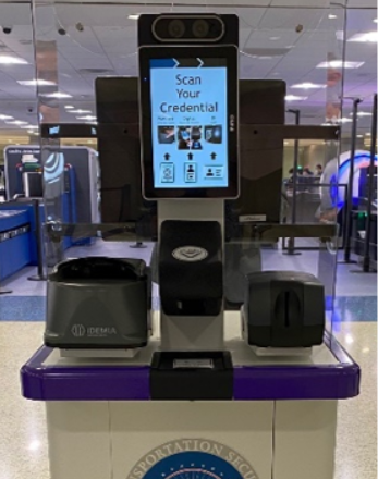(TSA最新一代证件识别设备,一侧让乘客扫ID,一侧给乘客现场拍照。安检人员侧的屏幕会自动比对ID照片与乘客照片的相似度,根据ID的姓名和生日等信息查找乘客航班信息,并做出是否通过的建议。)