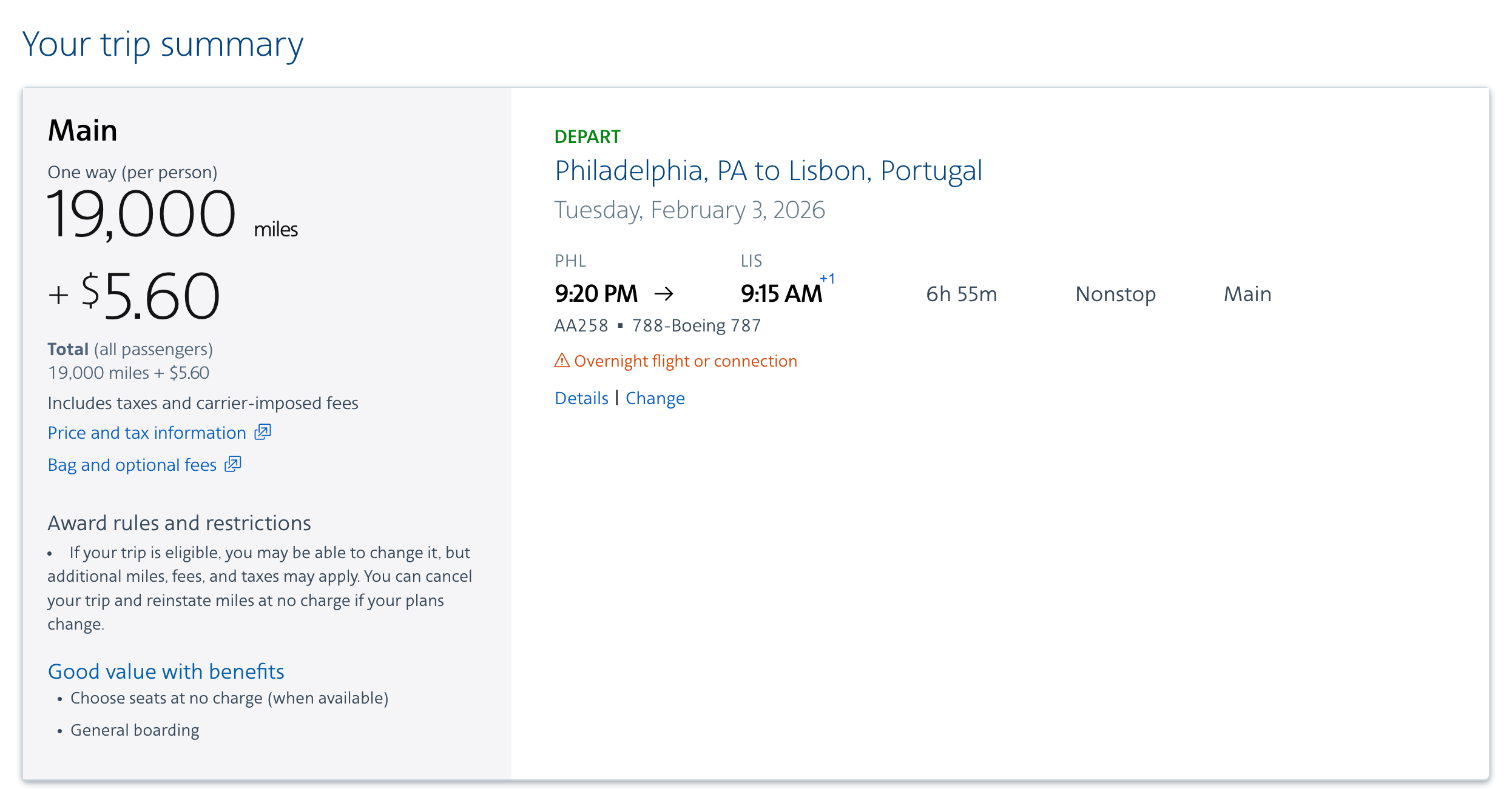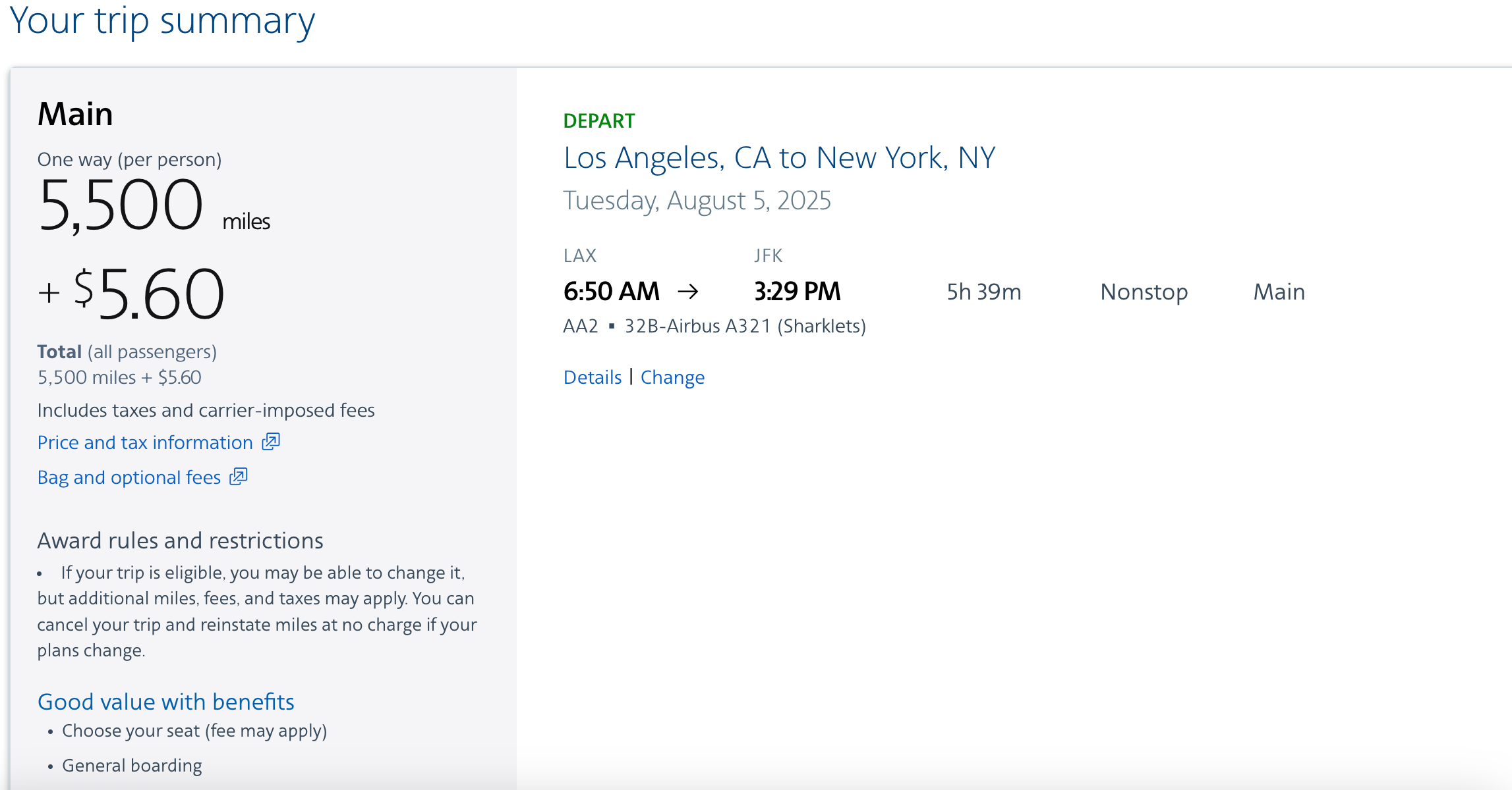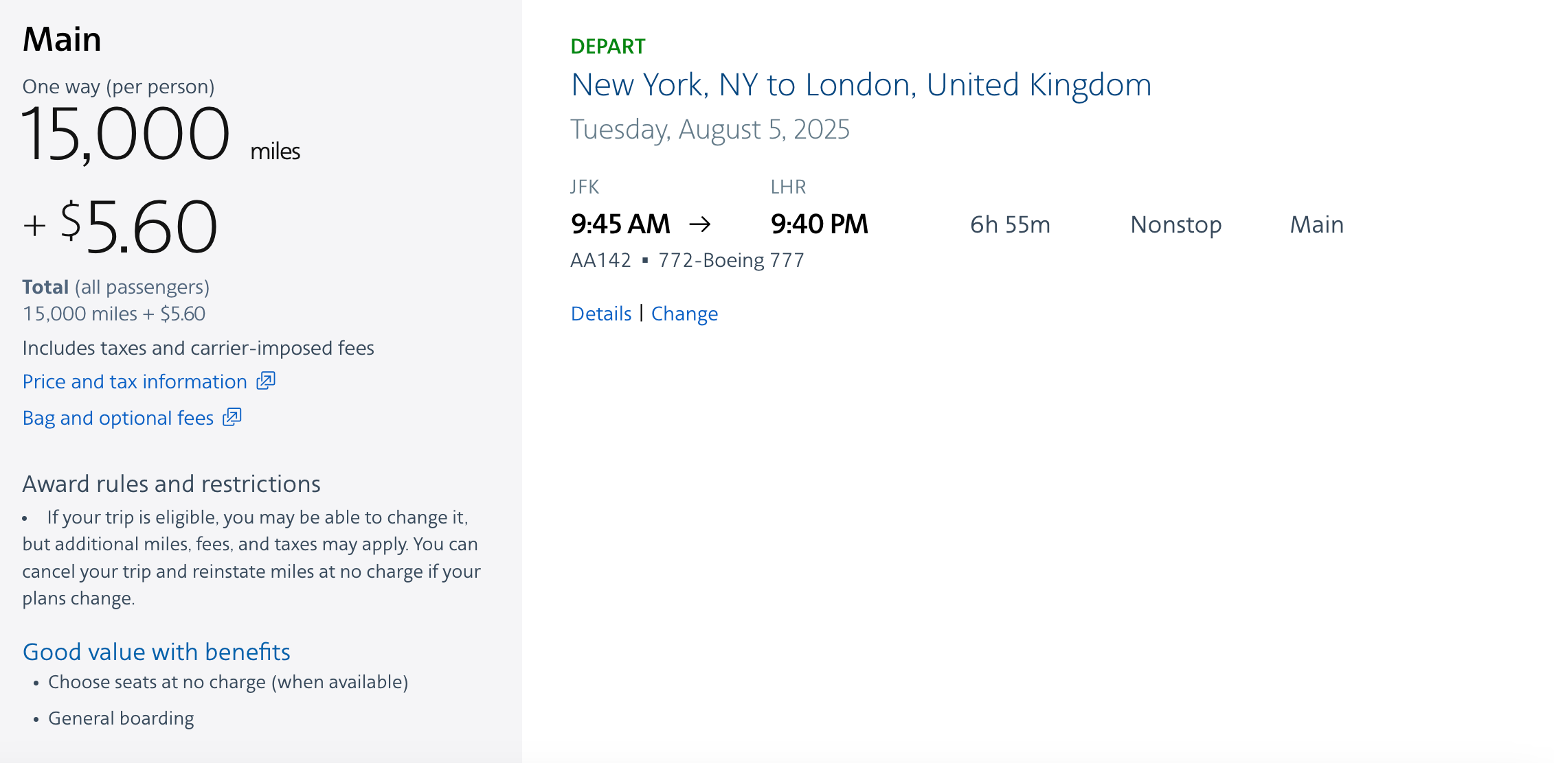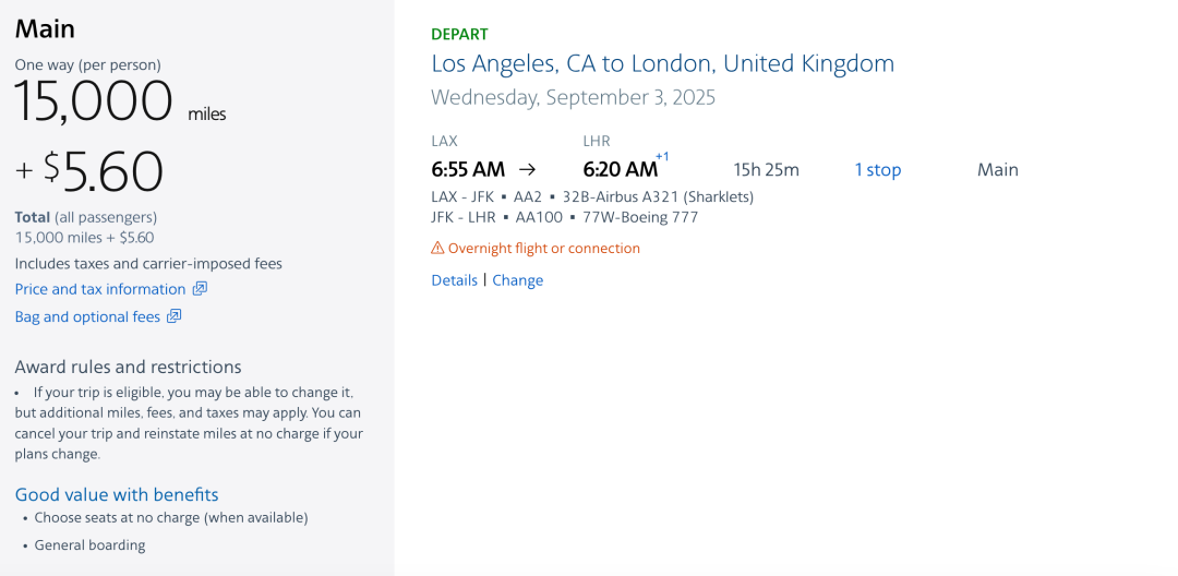 美国航空国内航班的现金票最低价一般都是Basic Economy,不可退改,选座需付费,有诸多限制,所以这样的普通经济舱里程兑换,可以退改友好且能有更多待遇,非常划算,如果你时间合适抓紧时间上车哦~