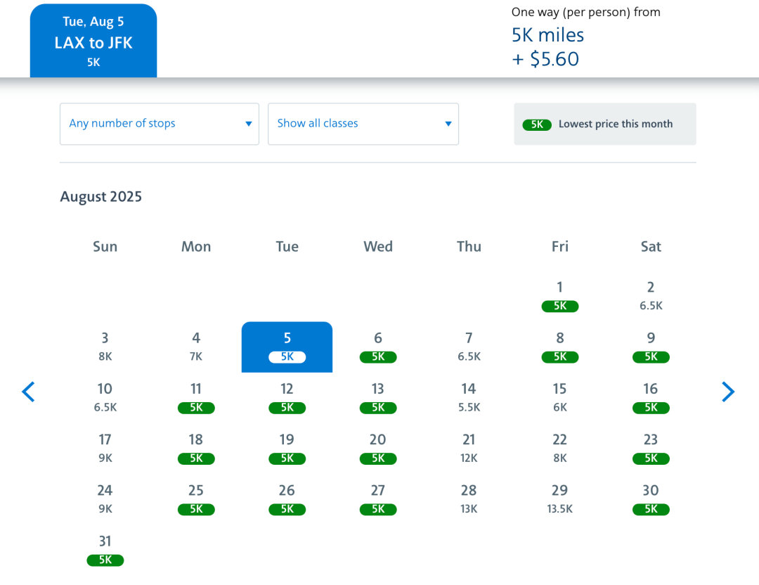 5k里程起+少量税费(美国国内航班/中美洲加勒比海航班)