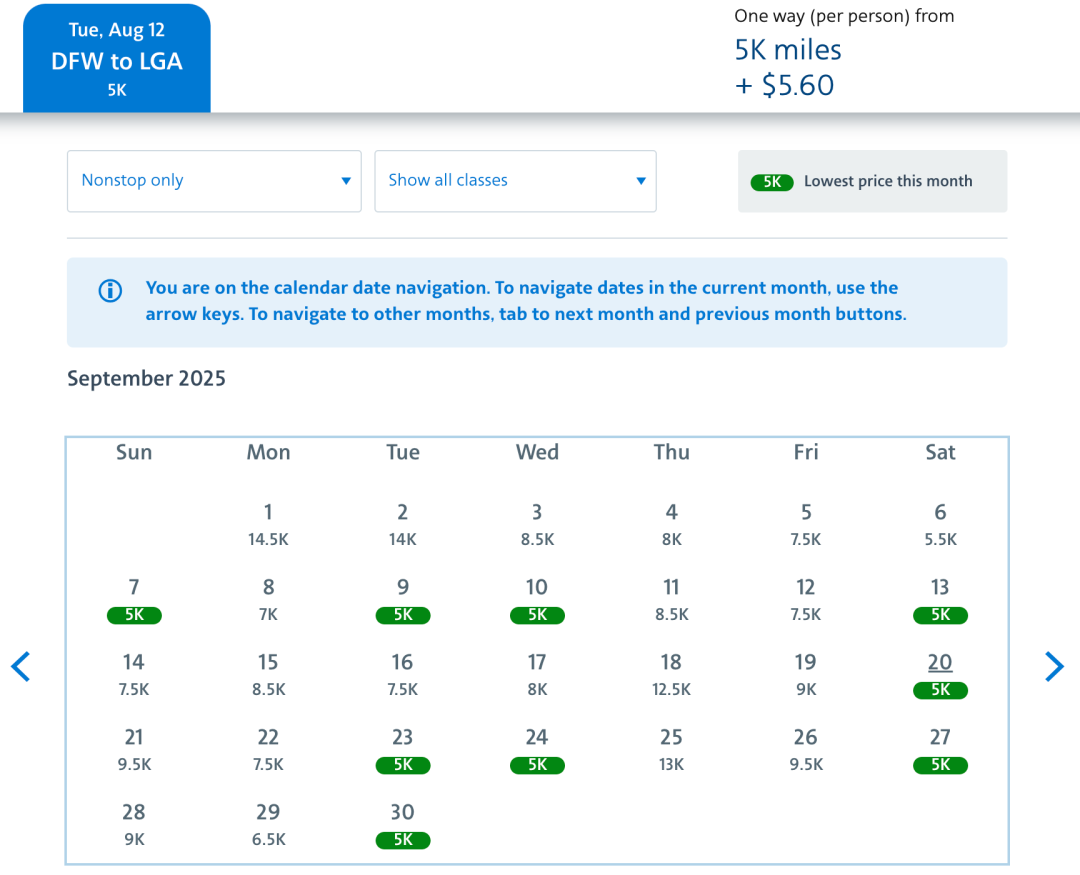 而达拉斯直飞纽约,日期就多了,以9月为例(仅查看直飞航班的最低价)