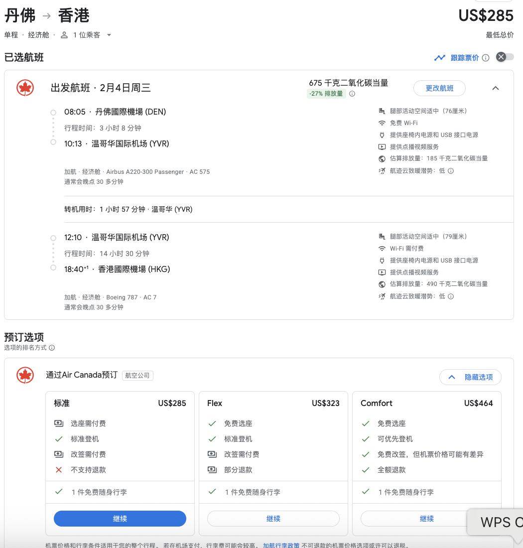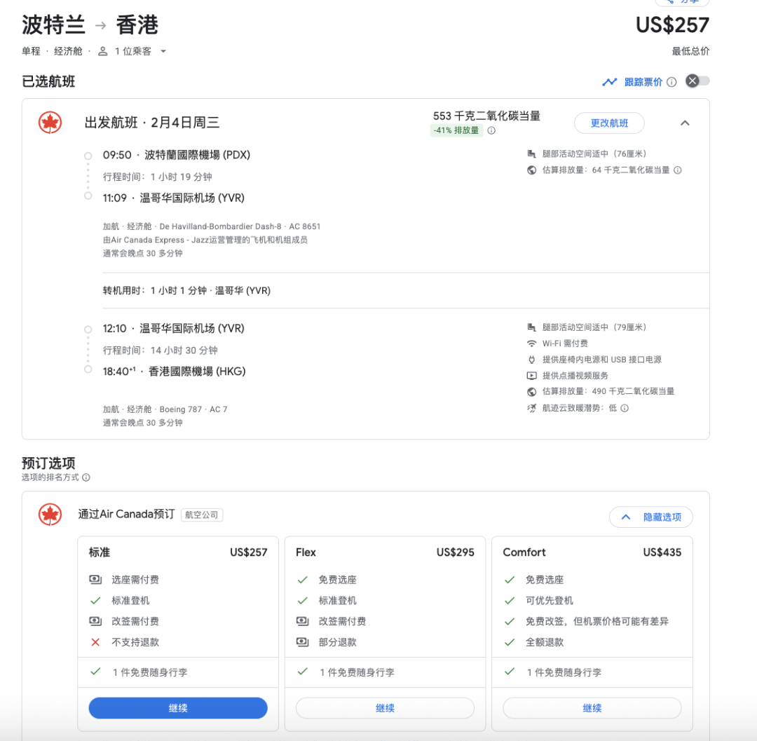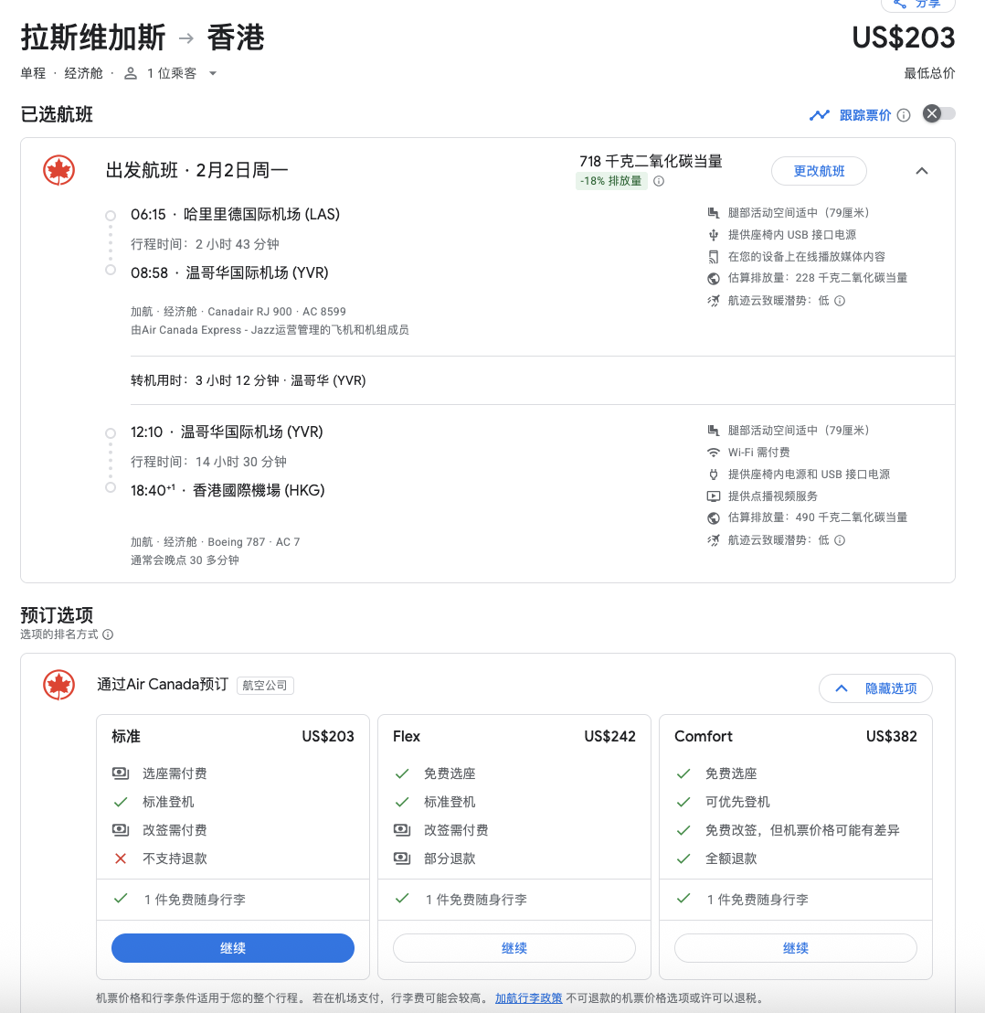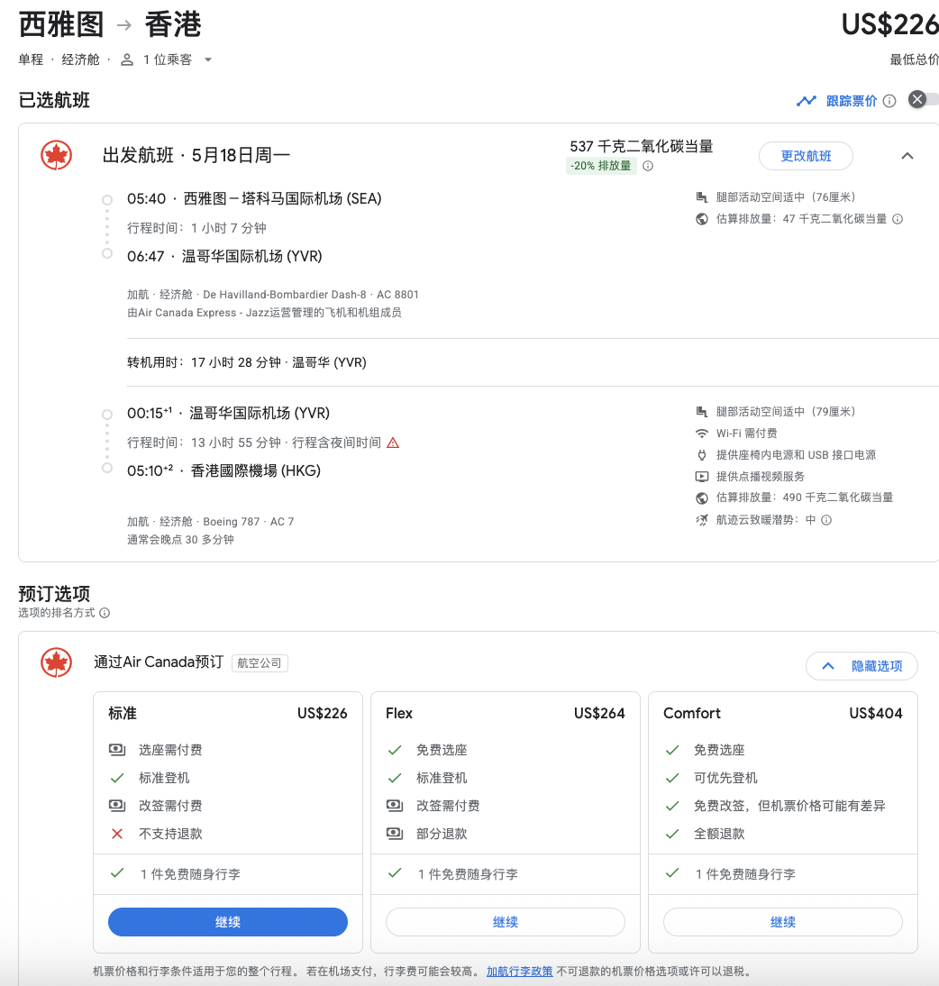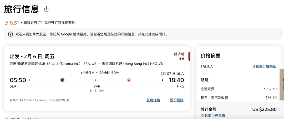 春节前夕2月6号西雅图飞香港,单程含税225.90美金
