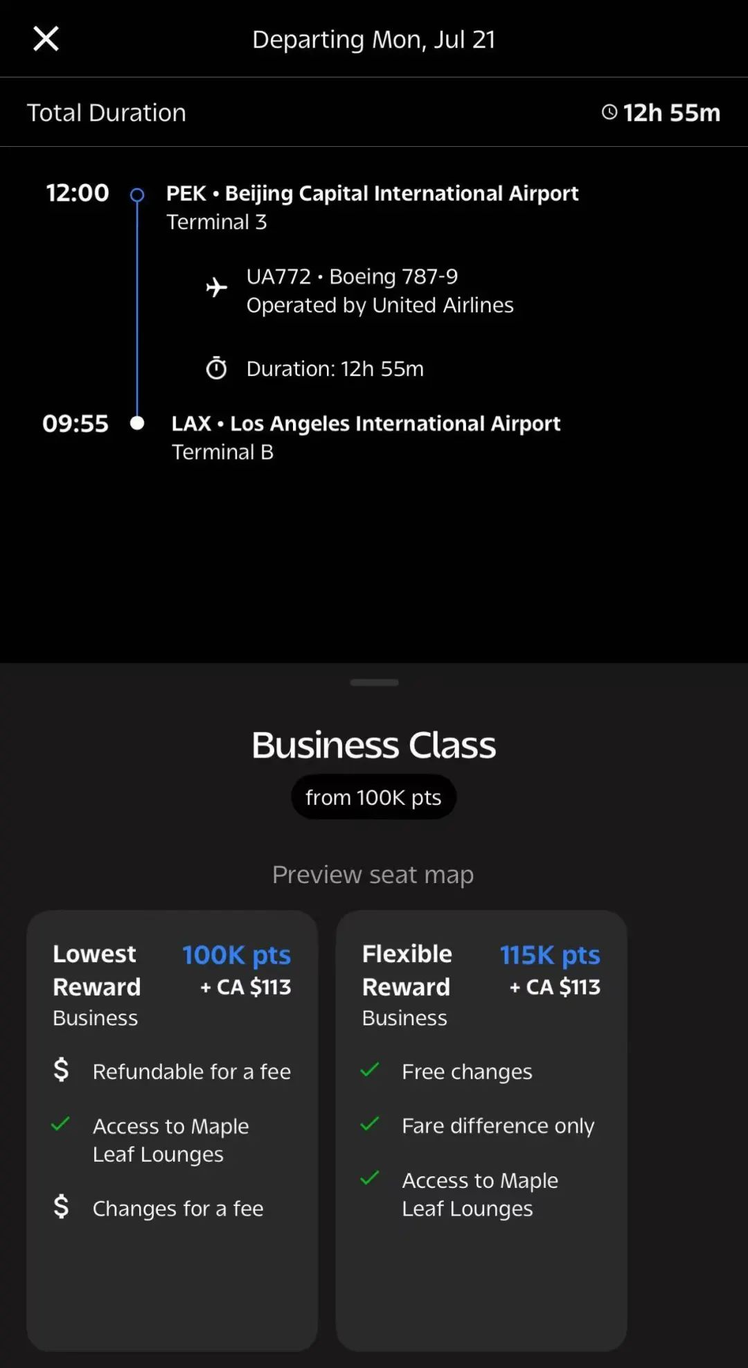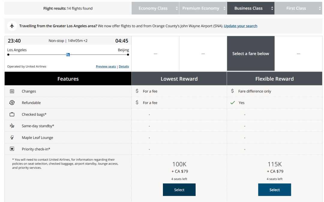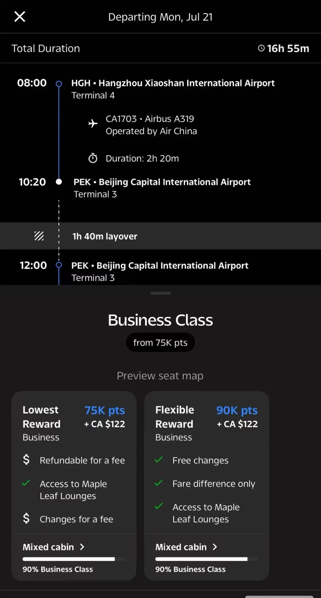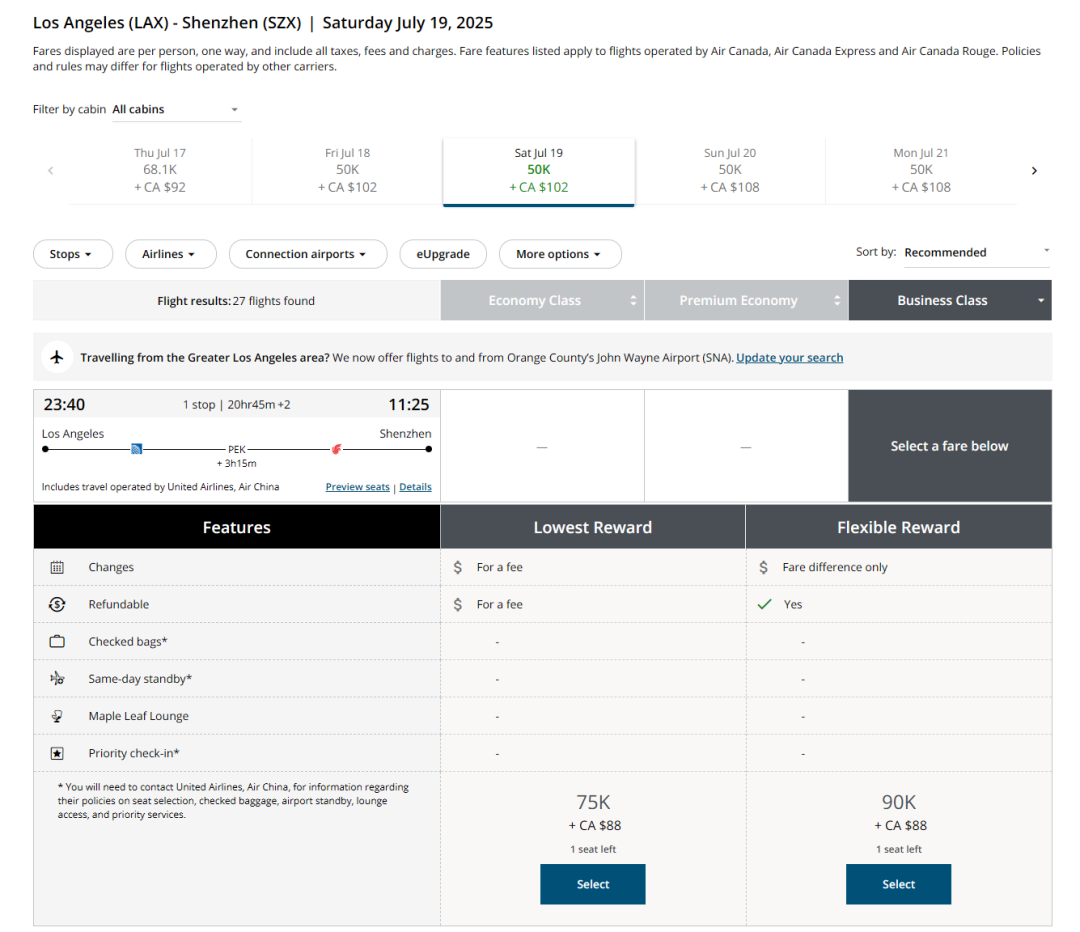 那么,使用Aeroplan更好的一点则是如果加一段中国国内的深航、国航,需要的里程数低了一些~