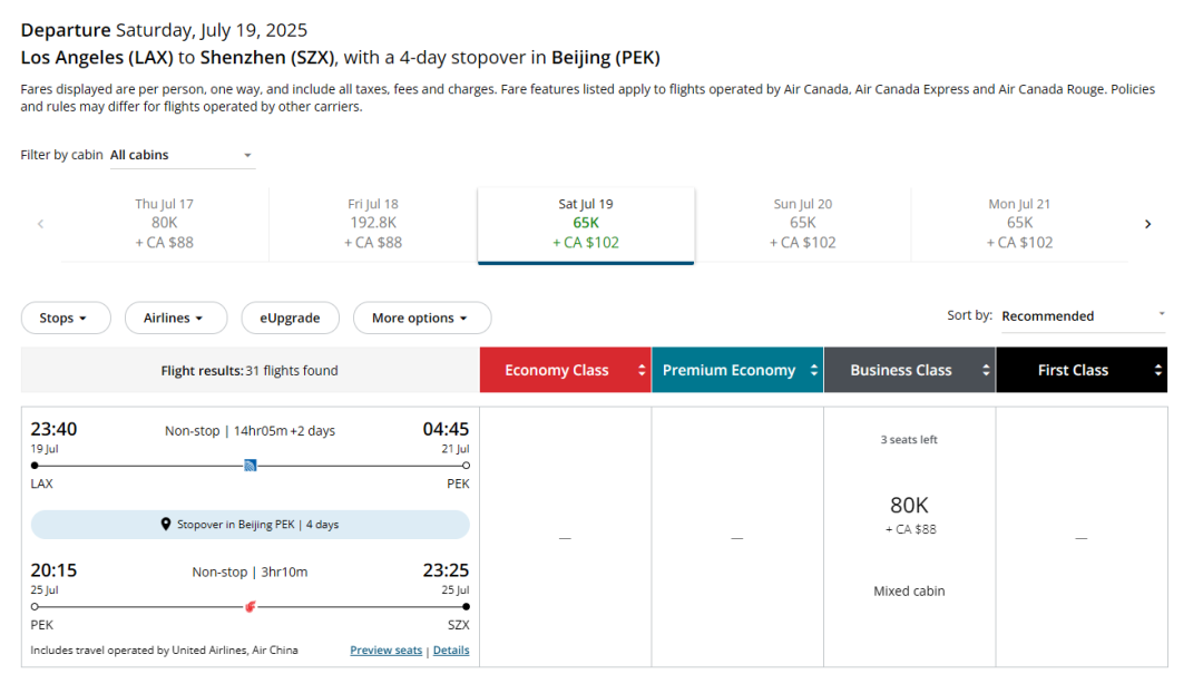 当然,使用加航里程,你可以利用额外5000点stopover的政策,在北京玩几天,然后飞去目的地~