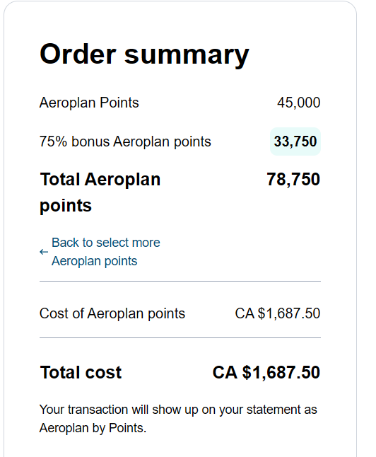 买45k,可有75%的加赠,一共获得78750分 ,一共是1687.50加币(约8824元)
