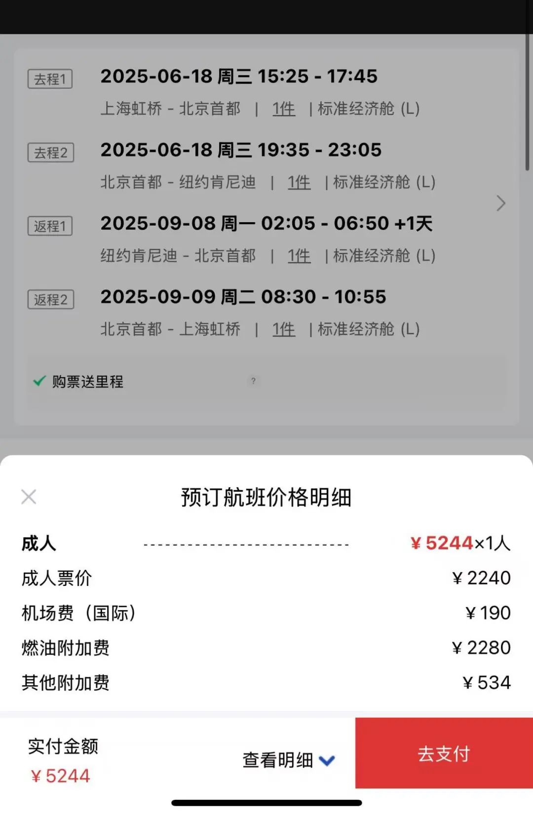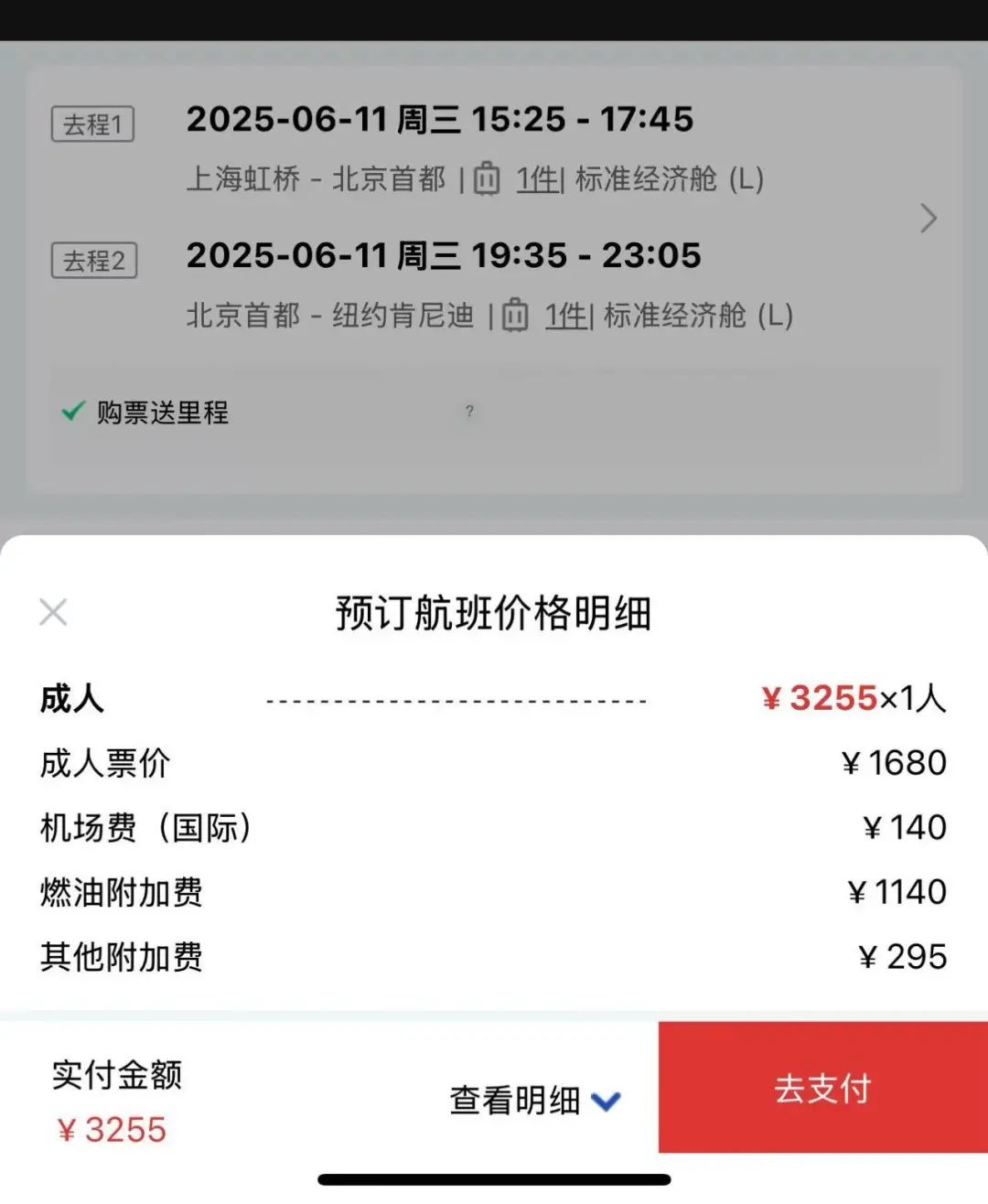 2)这张票不可以直接在北京上飞机~ 这是吸引上海乘客经由北京去纽约的促销。很遗憾,国内其他城市出发也没有这个价格。
