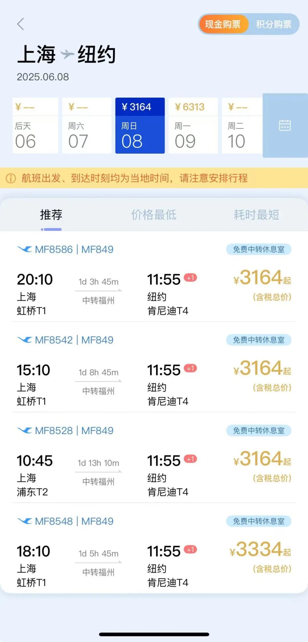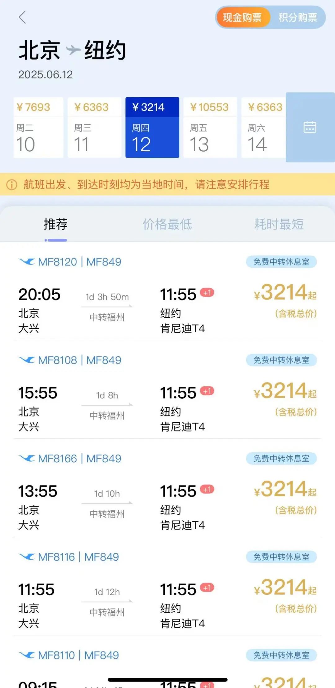 另外一家飞纽约的航司也有,价格还略微便宜写,但需要在福州过夜