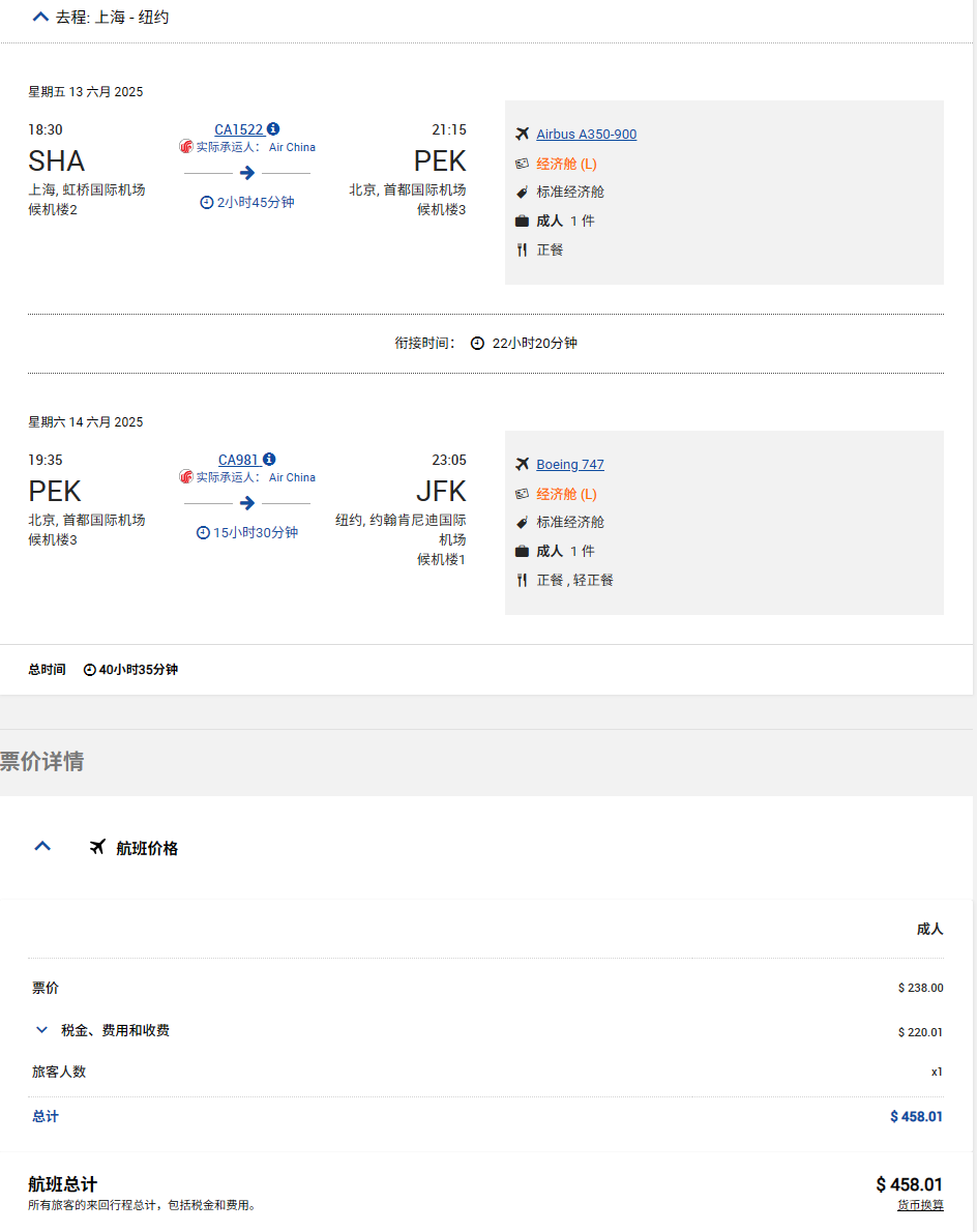 还是便宜且方便上海(长三角)的乘客飞往纽约。当日转机,不用过夜~ 国航使用波音747飞航北京-纽约航线,这是体验“空中皇后”的绝好机会~ 和东航一样,都是我们中国的航司,没有语言和额外转机签证的问题,