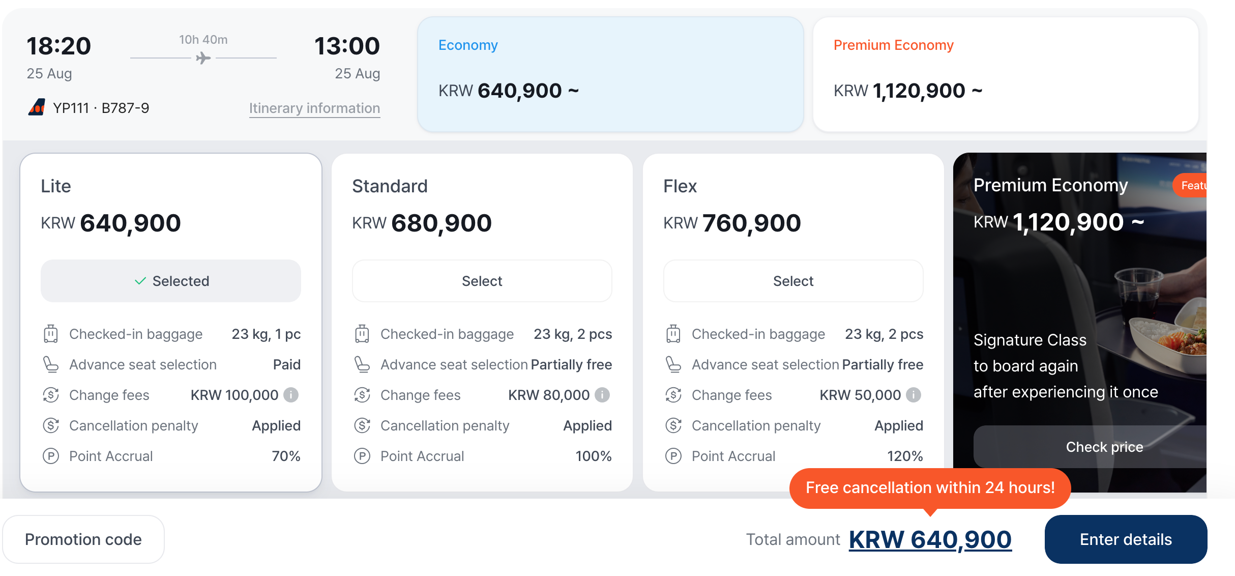 经济舱- Lite/Standard/Flex(具体字母舱位不重要,因为没有伙伴积分累积等)