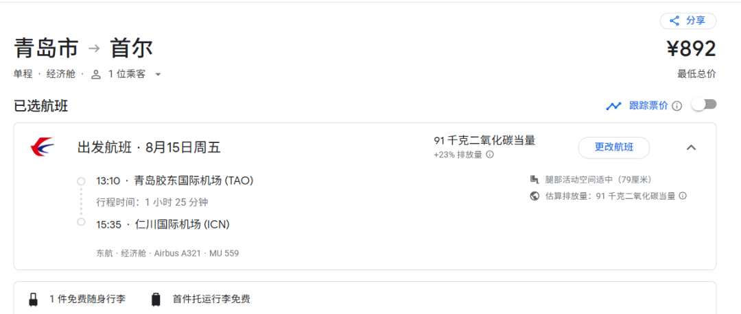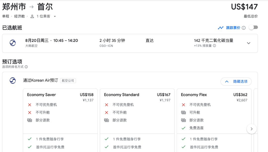 这张票尤其适合二线城市的同学们,因为本来前往北上广就需要坐几个小时的飞机/高铁,颇为不便,而首尔有大量的航班直飞各大城市,可以从家门口的机场飞首尔,相当于一转飞美国。比如说,郑州的同学可以买这班: