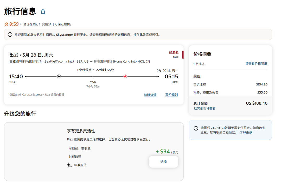 如果多34美金(总价222.40),可以升级至灵活经济舱