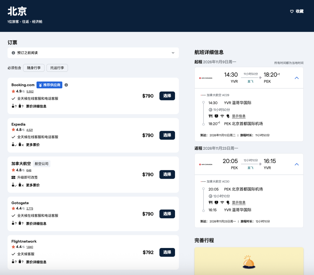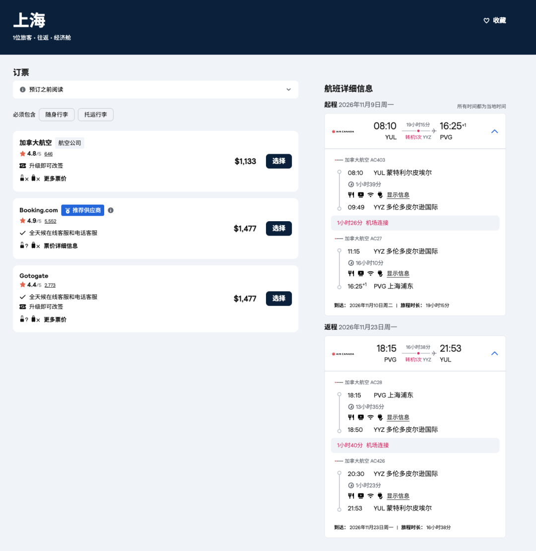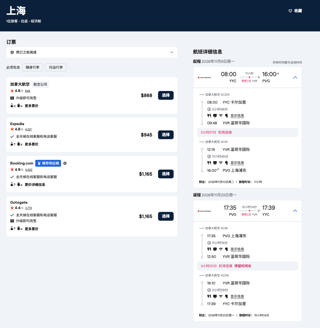 即使你不在多伦多/温哥华,全国联运的选择也非常好,比起其他转机选项价格更低、时间也短很多。