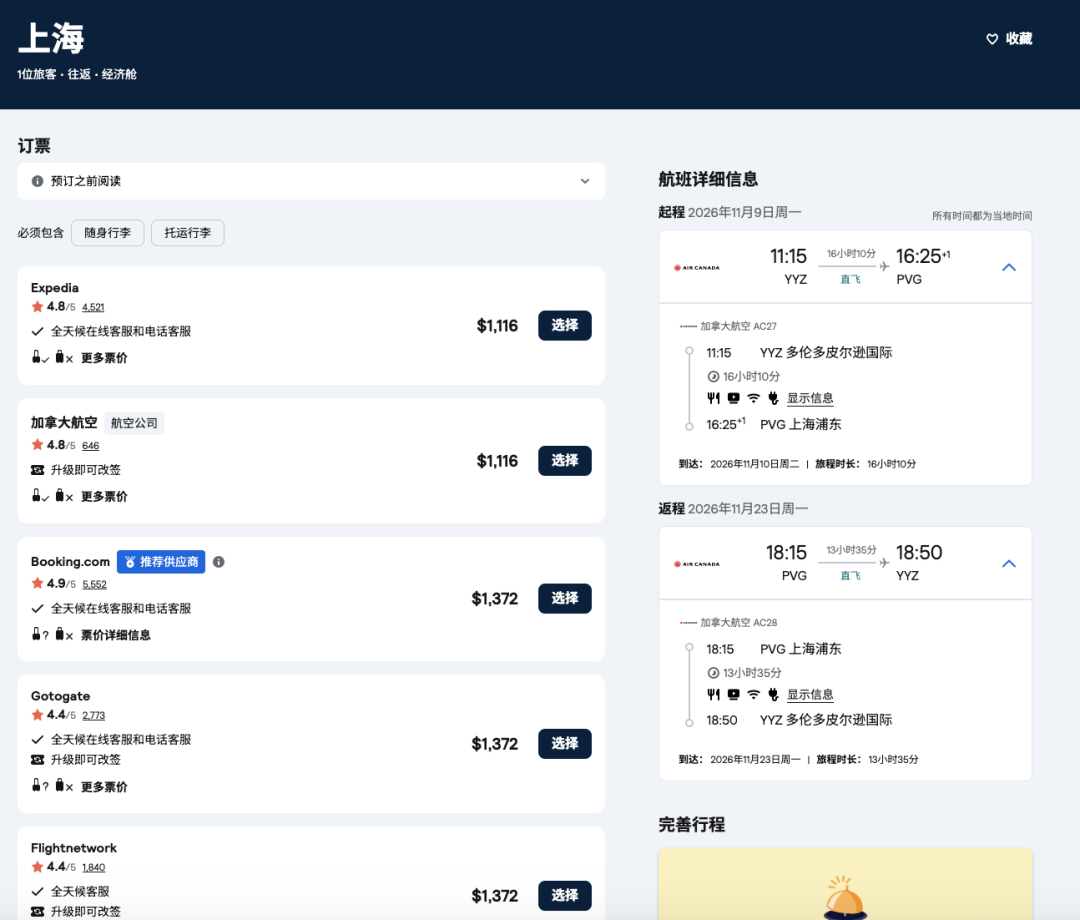 令人惊喜的是,加东的新航线,价格同样美丽!多伦多直飞往返上海1116美金。隔壁美国纽约直飞上海的航班,现阶段做梦都不太可能这么便宜。