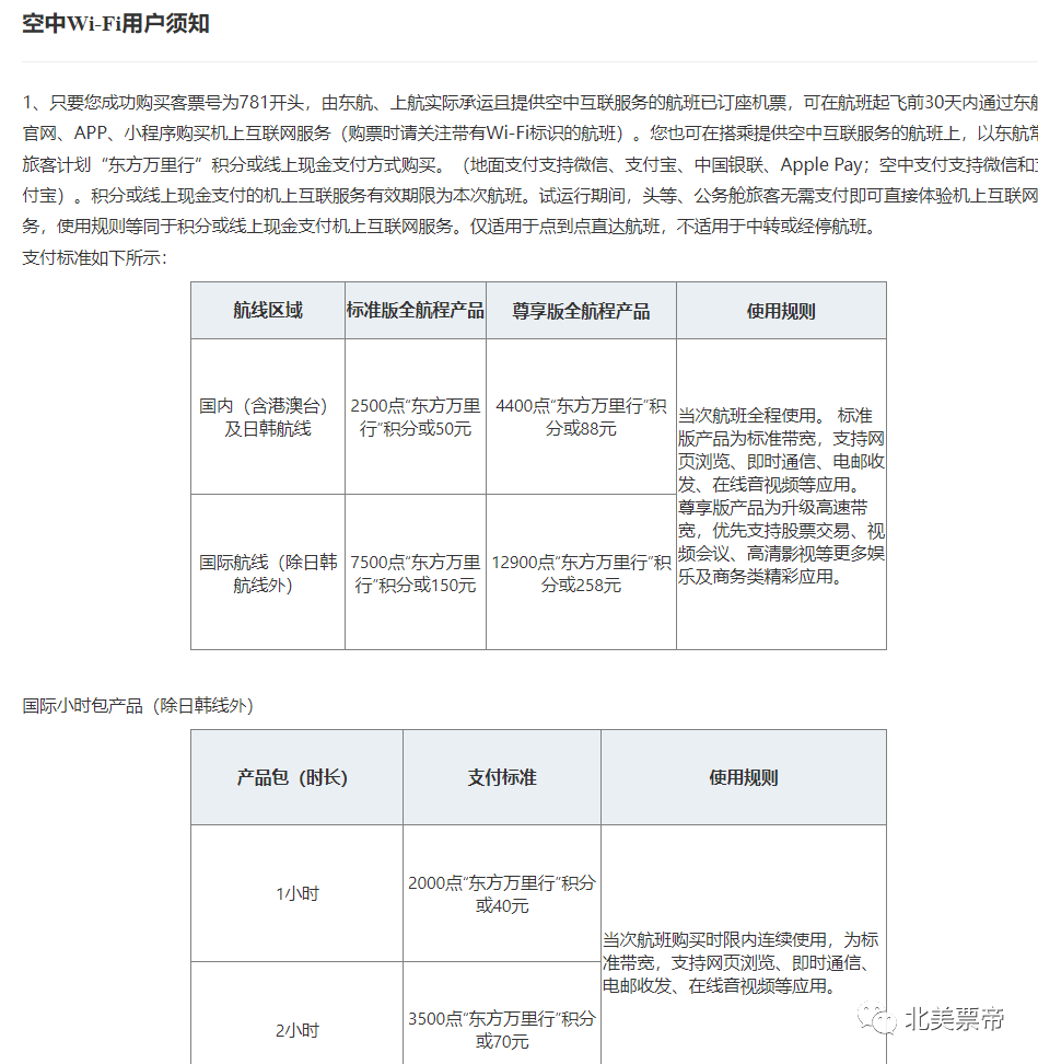 1)东航的宽体机(包括飞北美的B777-300ER)都可以提供上网服务,商务舱/头等舱的旅客将可以免费使用Wi-Fi,其他乘客则需要使用里程或者支付现金来获得Wi-Fi。还可以分小时购买。