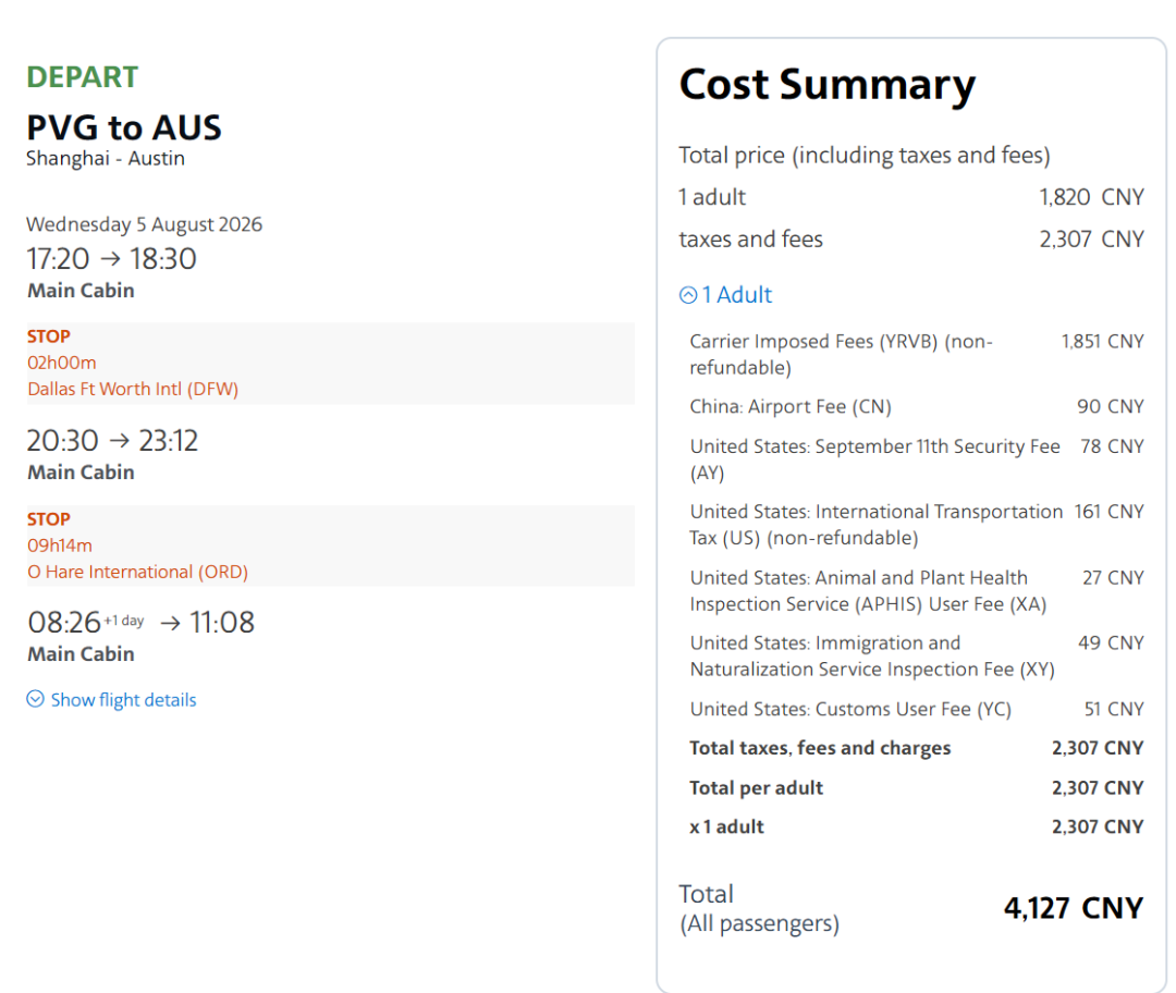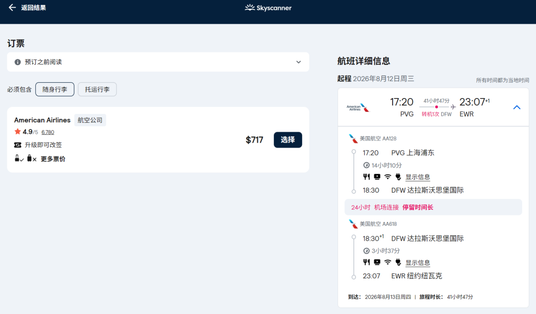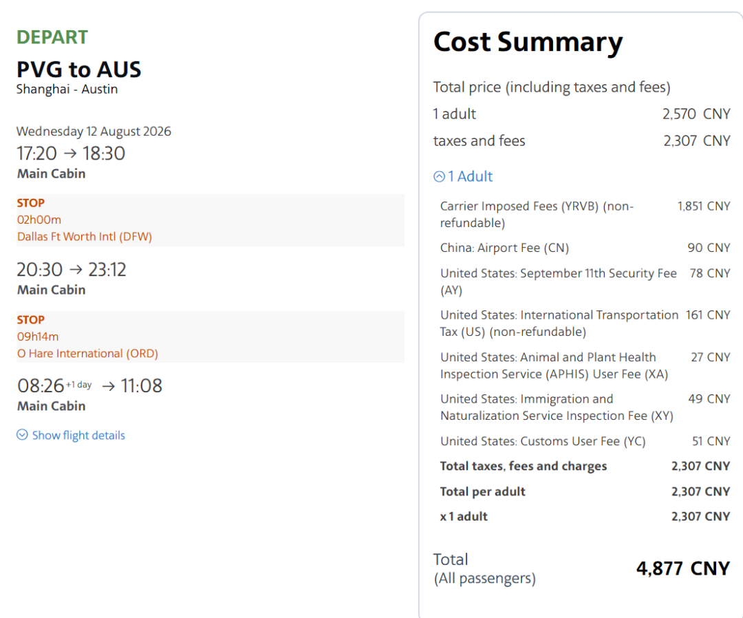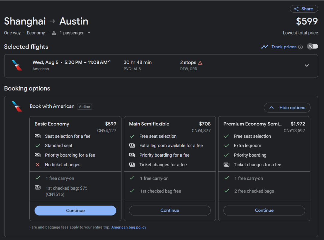 AA的上海-达拉斯航班一直是卖得非常贵,尤其是暑期,这是最赚钱的航线之一。因此,在8月最旺季能有这个好价格,实属不易,中美段直飞,没有签证顾虑,也不绕路,并不在一些大家心里觉得不安全的地方转机。