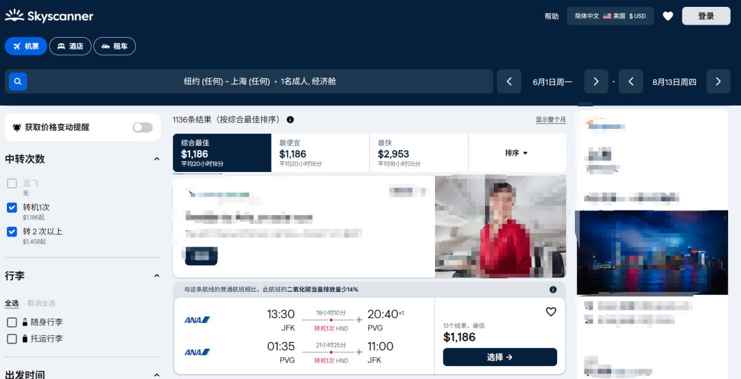 纽约-北京/上海 5月24日-8月14日 (其他时间是淡季,会更便宜)
