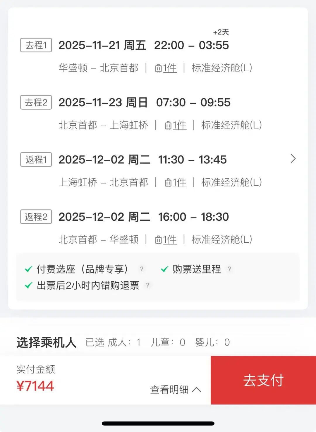 华盛顿杜勒斯-北京首都-国内 往返