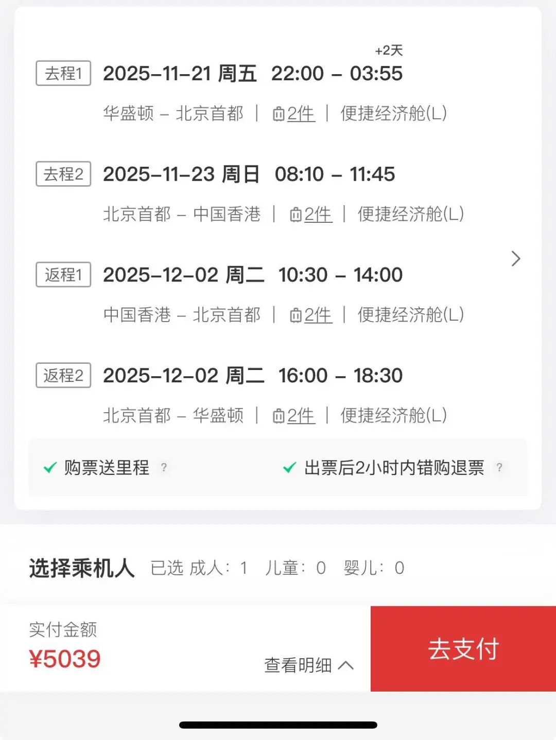 美国-北京中转-中国港澳台/境外(香港)行程,2件免费托运行李,每件不超过23公斤/50lb