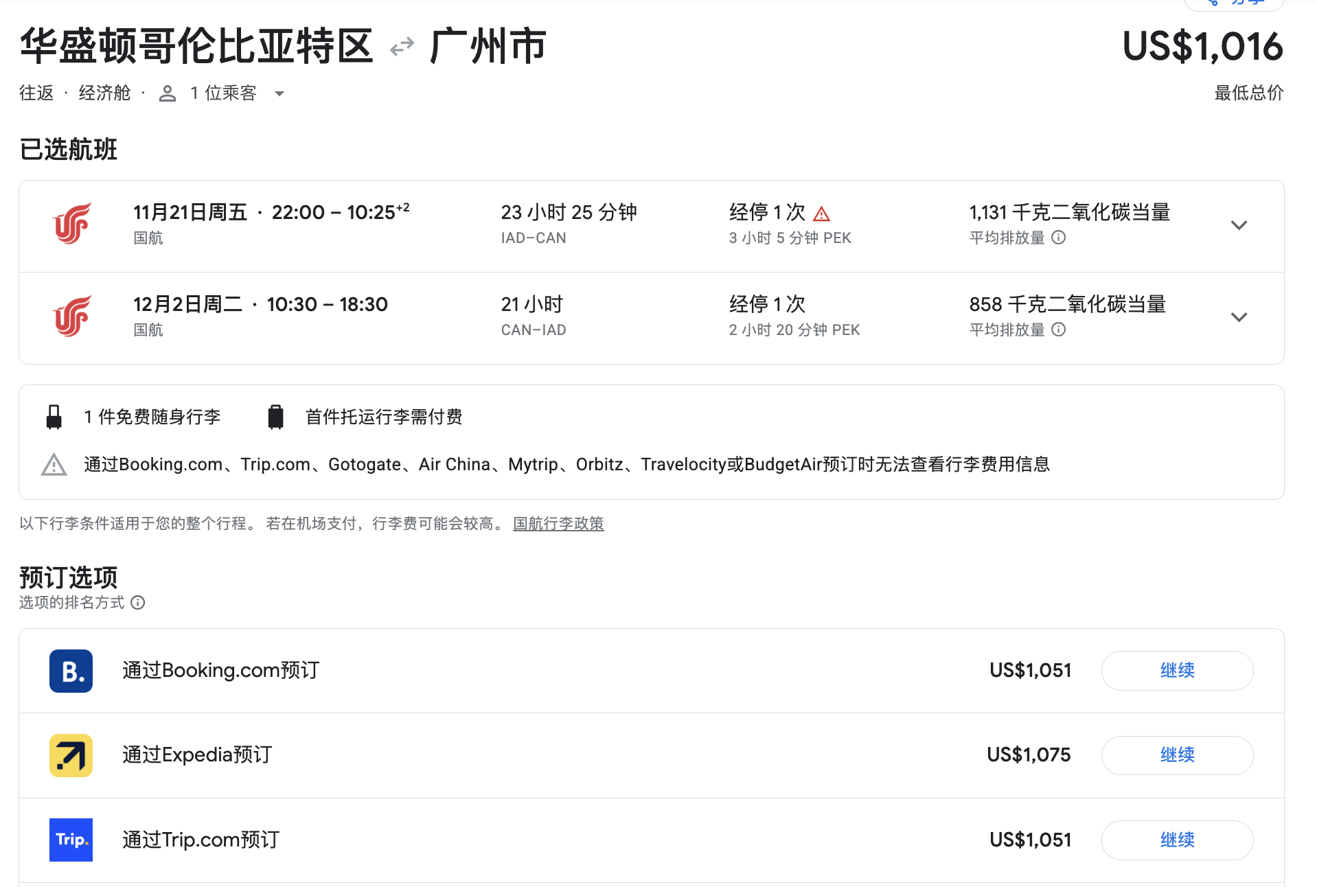以上截图来自国航APP/机票搜索网站