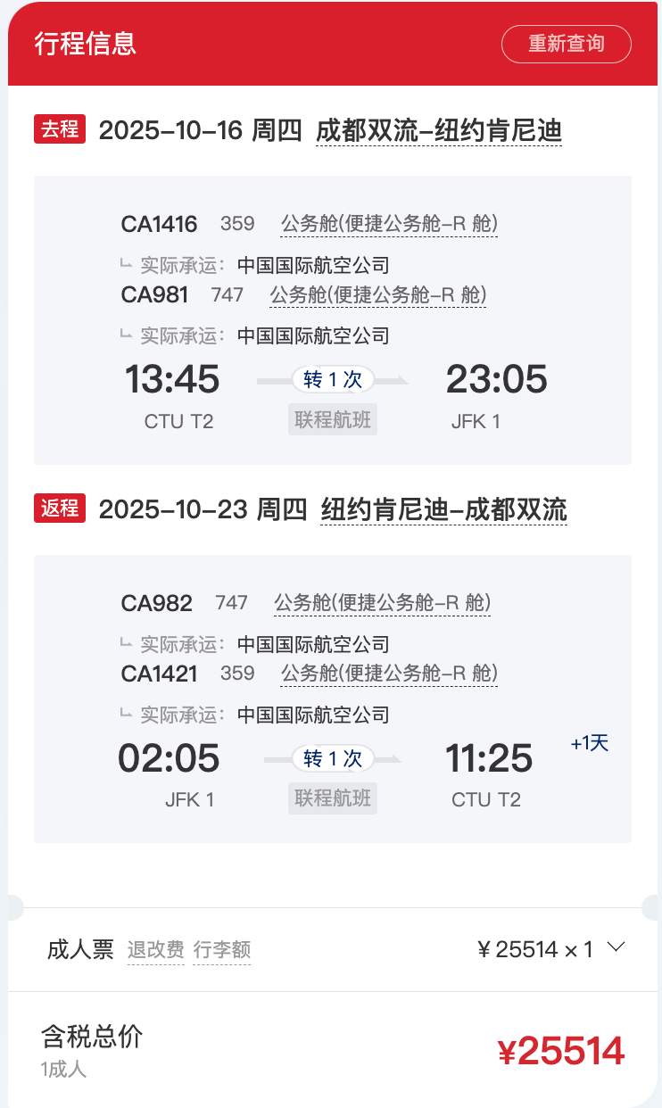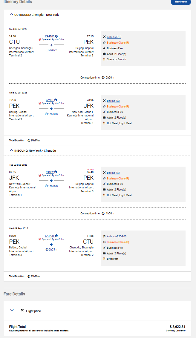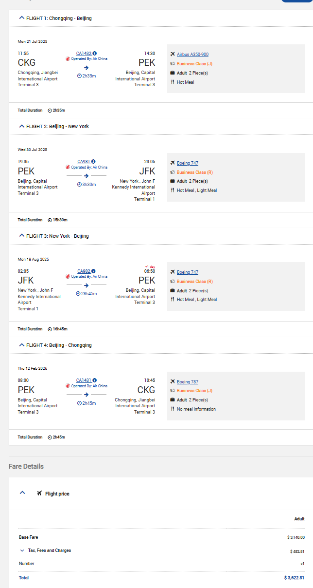 但是这张票很棒的一点是可以在北京做一个无限期的停留~ 也就是说,你可以先从川渝飞到北京,停留一阵子,再飞北京-纽约往返,最后等你想飞了,再飞北京-川渝~