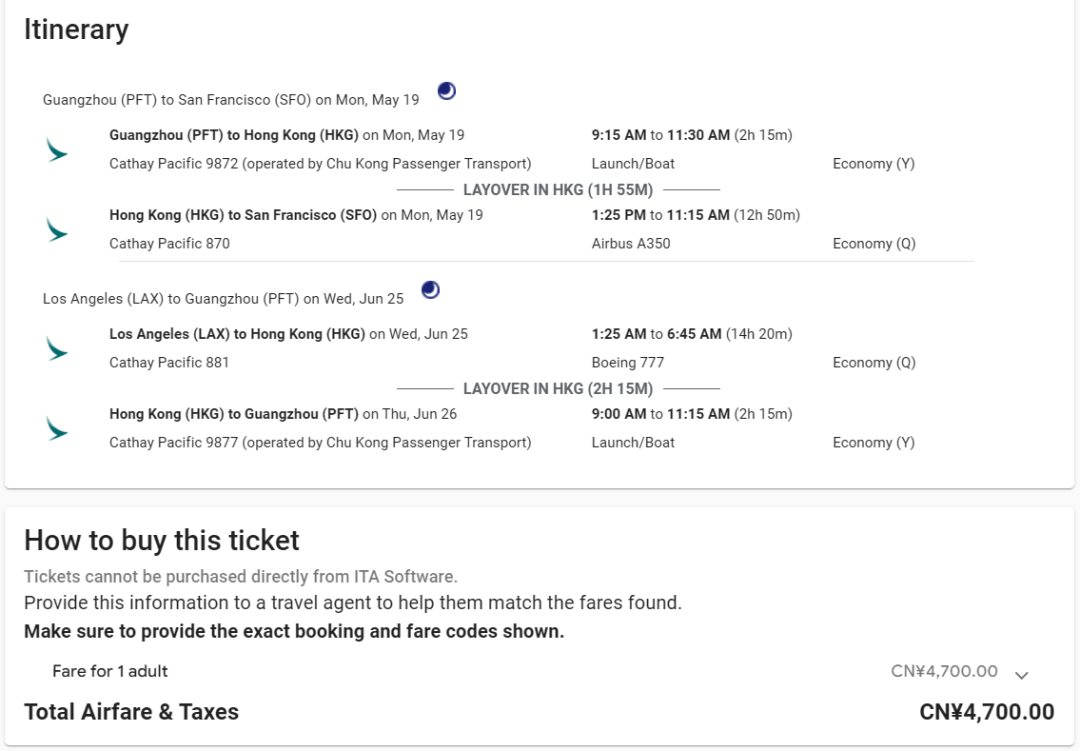 广州琶洲客运码头-香港机场,然后搭乘香港-洛杉矶直达航班