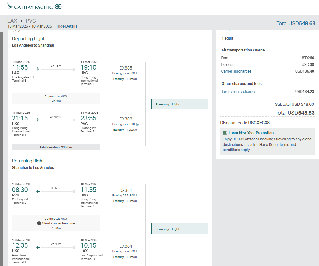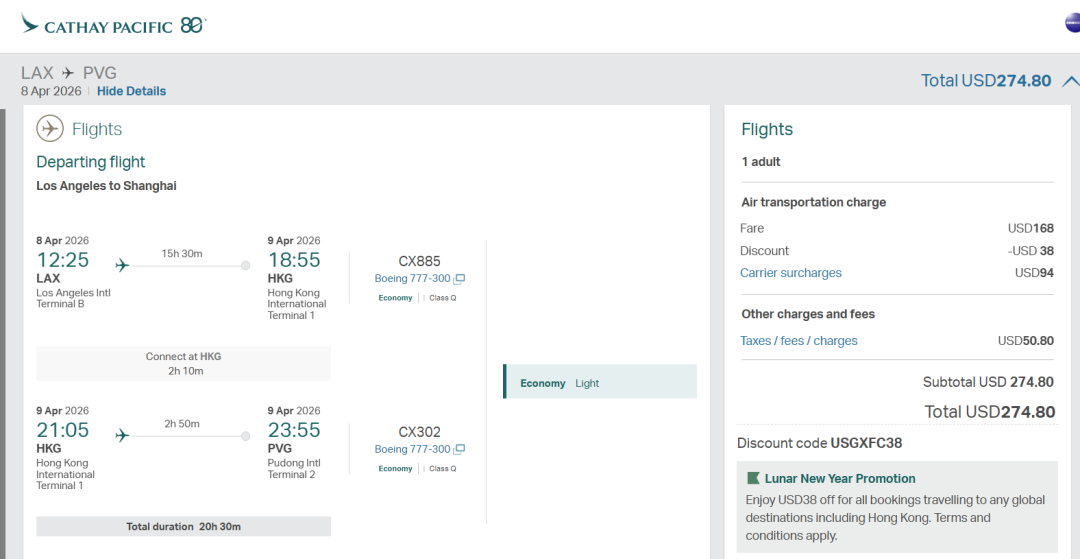 所有中美航线中,洛杉矶与上海间绝对是最热门的,也是各家航司争夺最凶狠的航线之一。在直飞航班运价不高的大前提下,转机航司更是想用更多优惠的价格来吸引客流,比如今天我们发现的国泰航空,这次又来更低了!