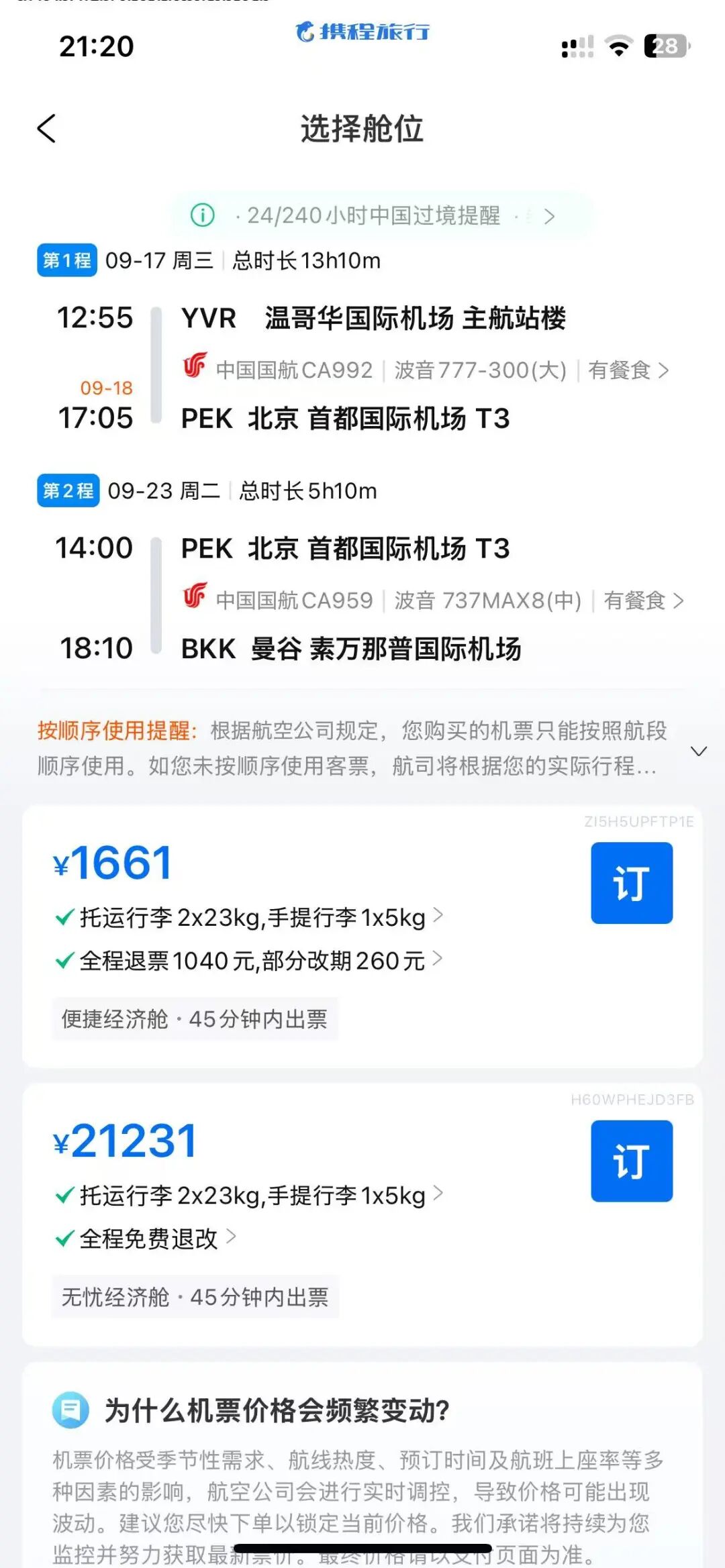 温哥华YVR- 北京首都PEK- 曼谷素万那普BKK