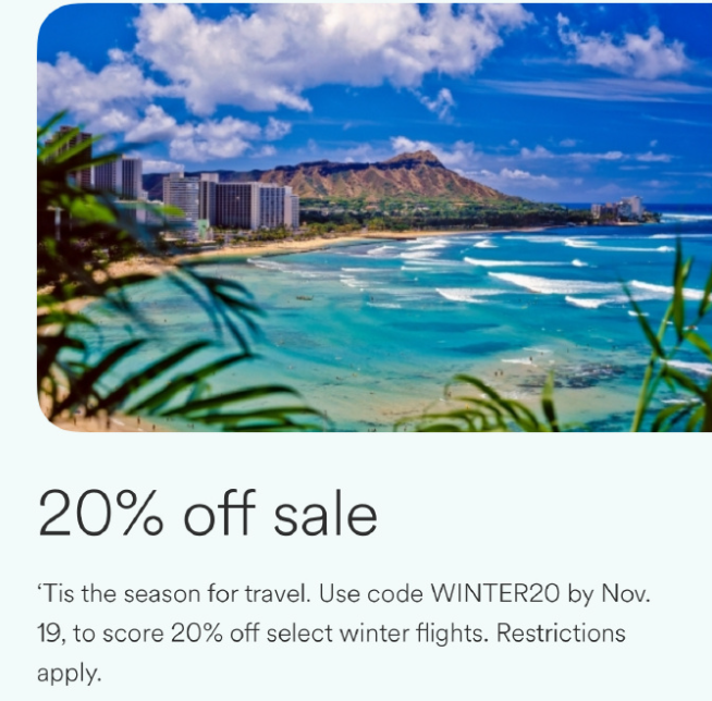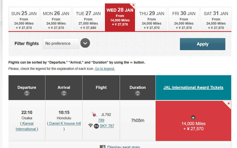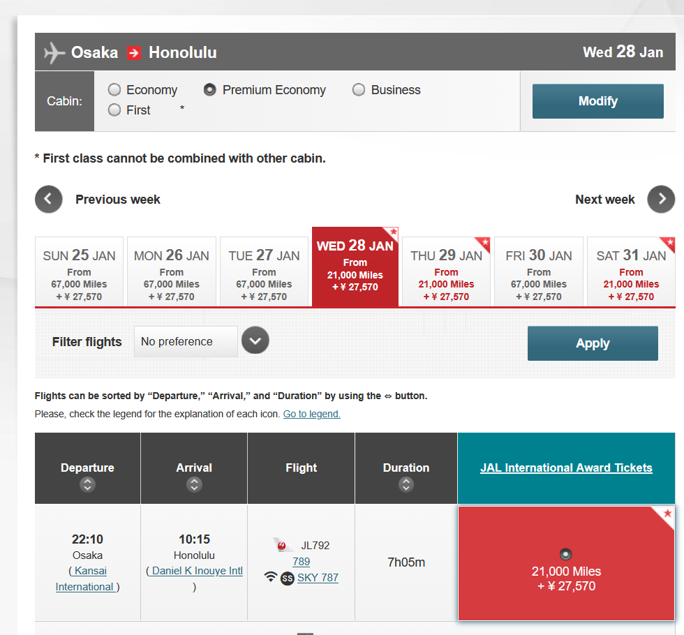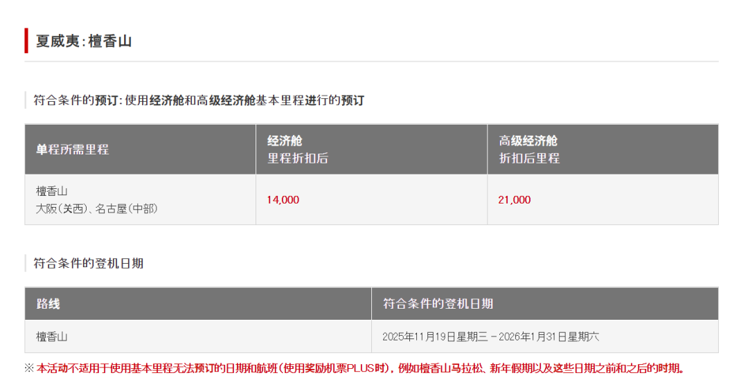优惠后,日本-夏威夷檀香山HNL,经济舱14k里程,豪华经济舱21k里程,燃油附加费在千余人民币左右。其余舱等不打折。旅行时间在11月19日-1月31日之间