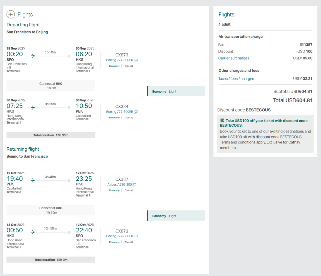 淡季碰上折上折,600美金出头往返北京~ 香港出发直飞85折,国泰双向的折扣券,比旅行社还便宜了!