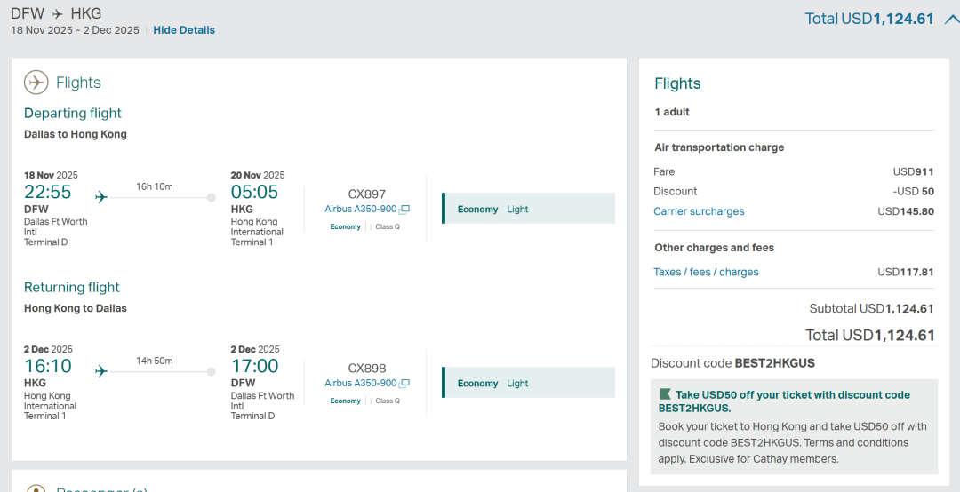 有些人一定得要飞直飞的,达拉斯-香港的直飞航线感恩节也可以减50美金,看着选择吧~ (这个时候可以问问旅行社)