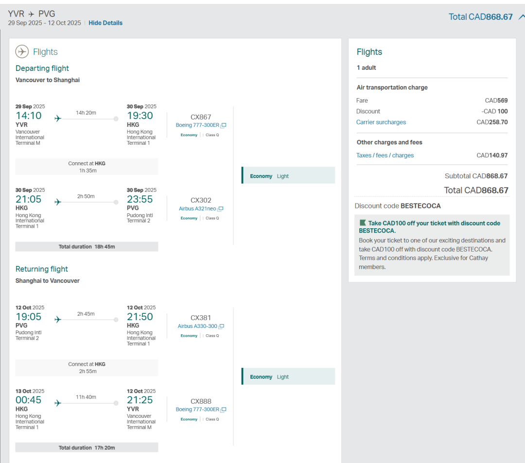 同样,要票面价格越低越好。国泰在加拿大始发的航线上,在温哥华-香港-上海在做促销,票面价格已经是各家航司较低的了(往返969加币),然后现在再减100加币(同样比给多数旅行社的折扣高),含税只要869加币(4543人民币),价格也还行吧~