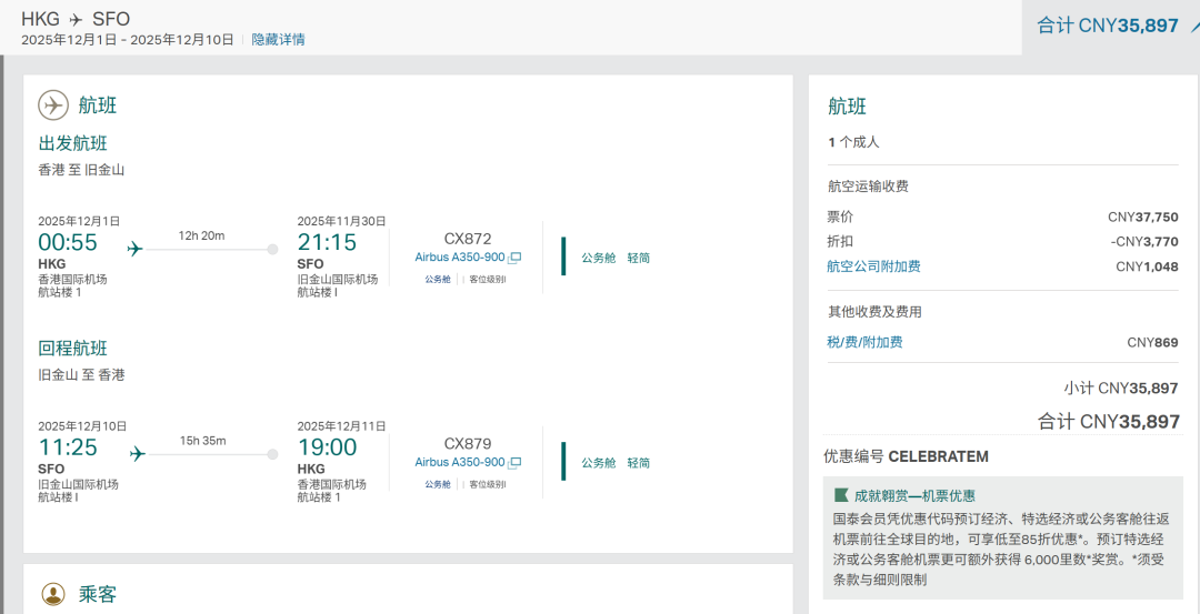 乘坐特选经济舱、商务舱还可获得6000 国泰里程