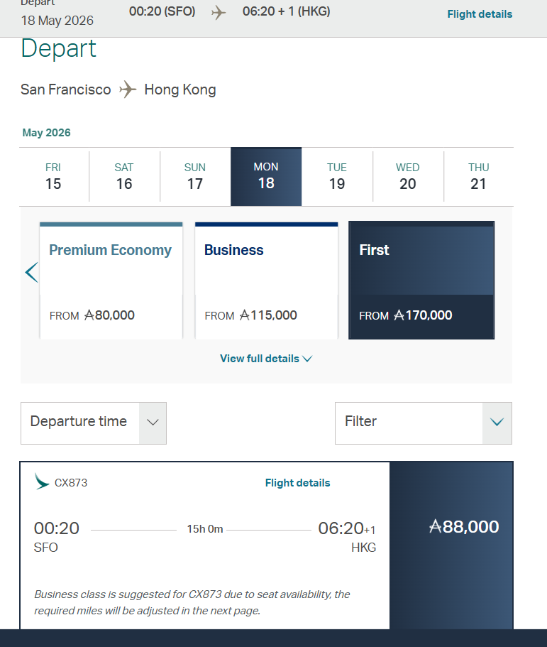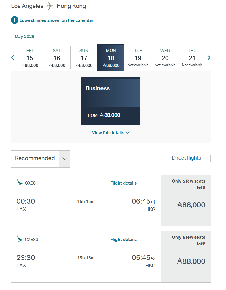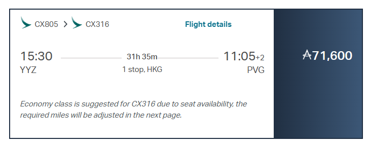 由于国泰是按照飞行总里程分段计费的话,若飞行距离超过7500里程(如上海-香港-洛杉矶),需要的兑换里程就和东海岸回国一样了。【香港-洛杉矶 的飞行距离约为7260英里,非常接近7500英里了】