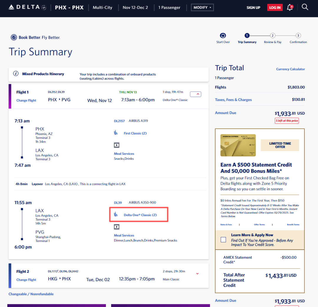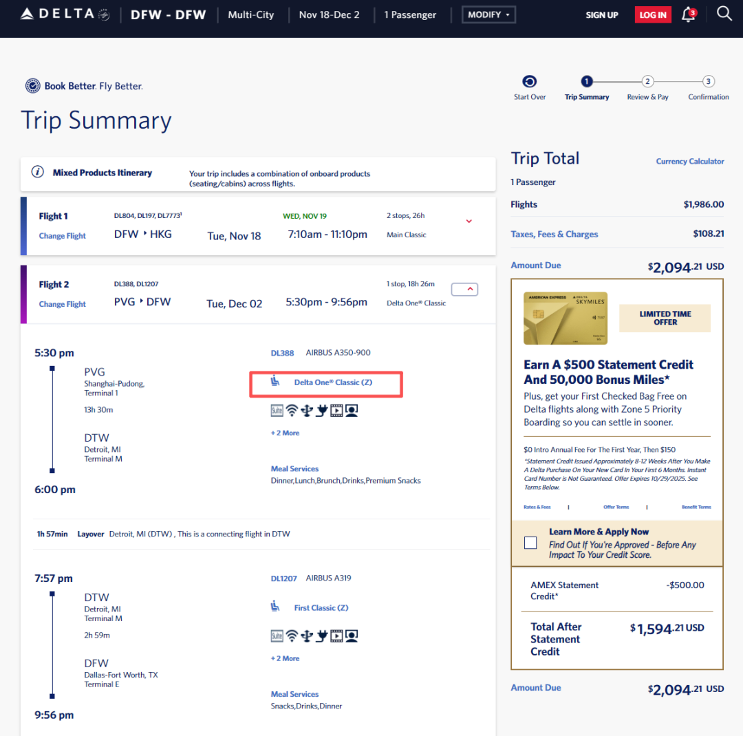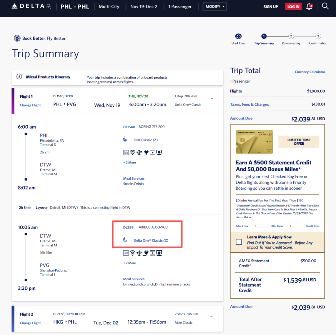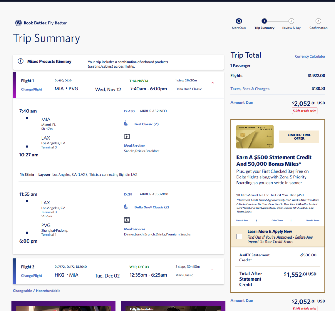 3)这张票在达美官网可以出,也建议在达美官网出~ 因为可以用上delta 礼卡、AMEX offer(如有)、delta ecredit等。但达美官网有个问题:经常只能出自己的代码共享的航班,这会导致价格上涨。此时,可考虑联系达美电话客服通过报航班号的方式订票。