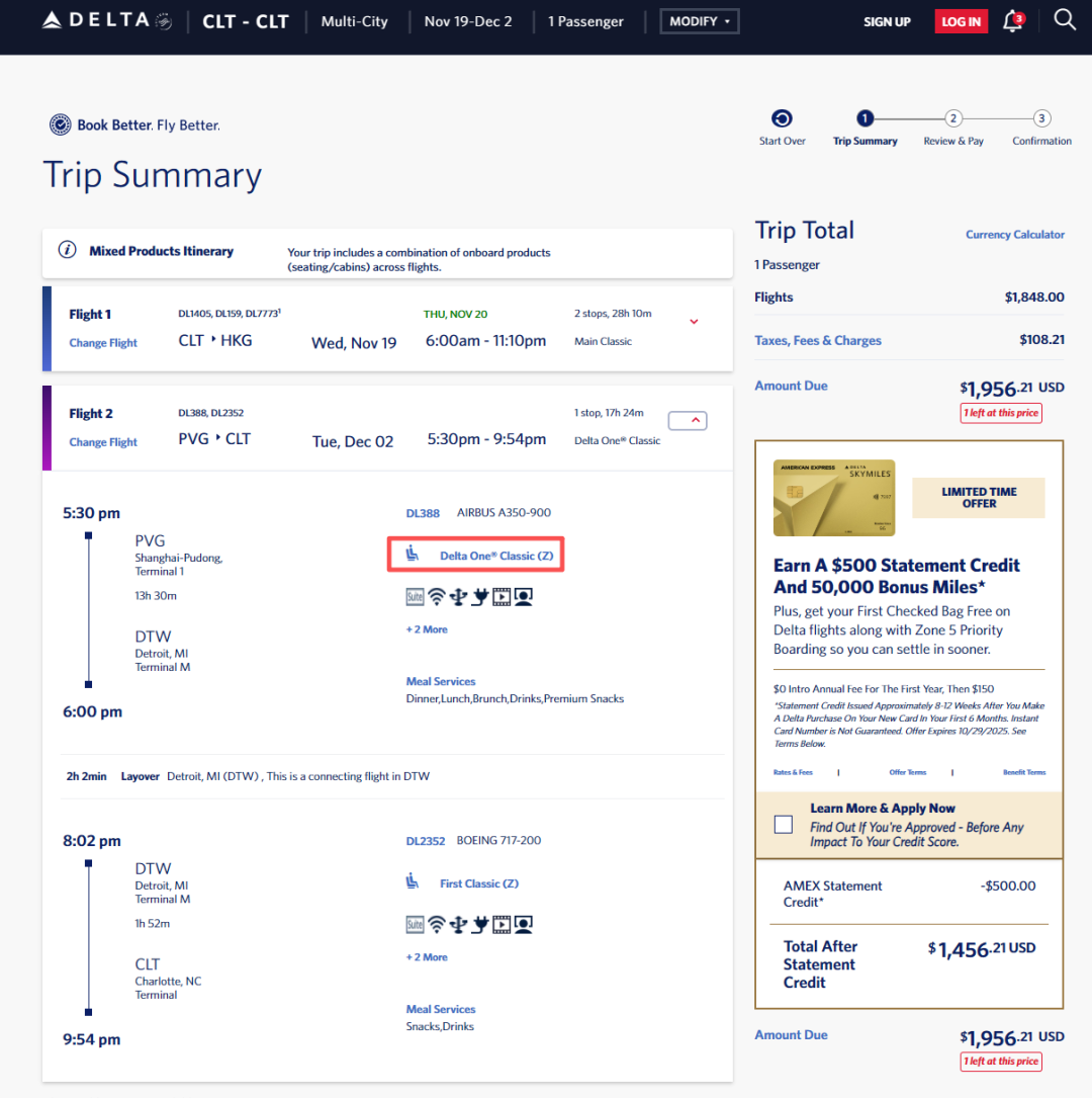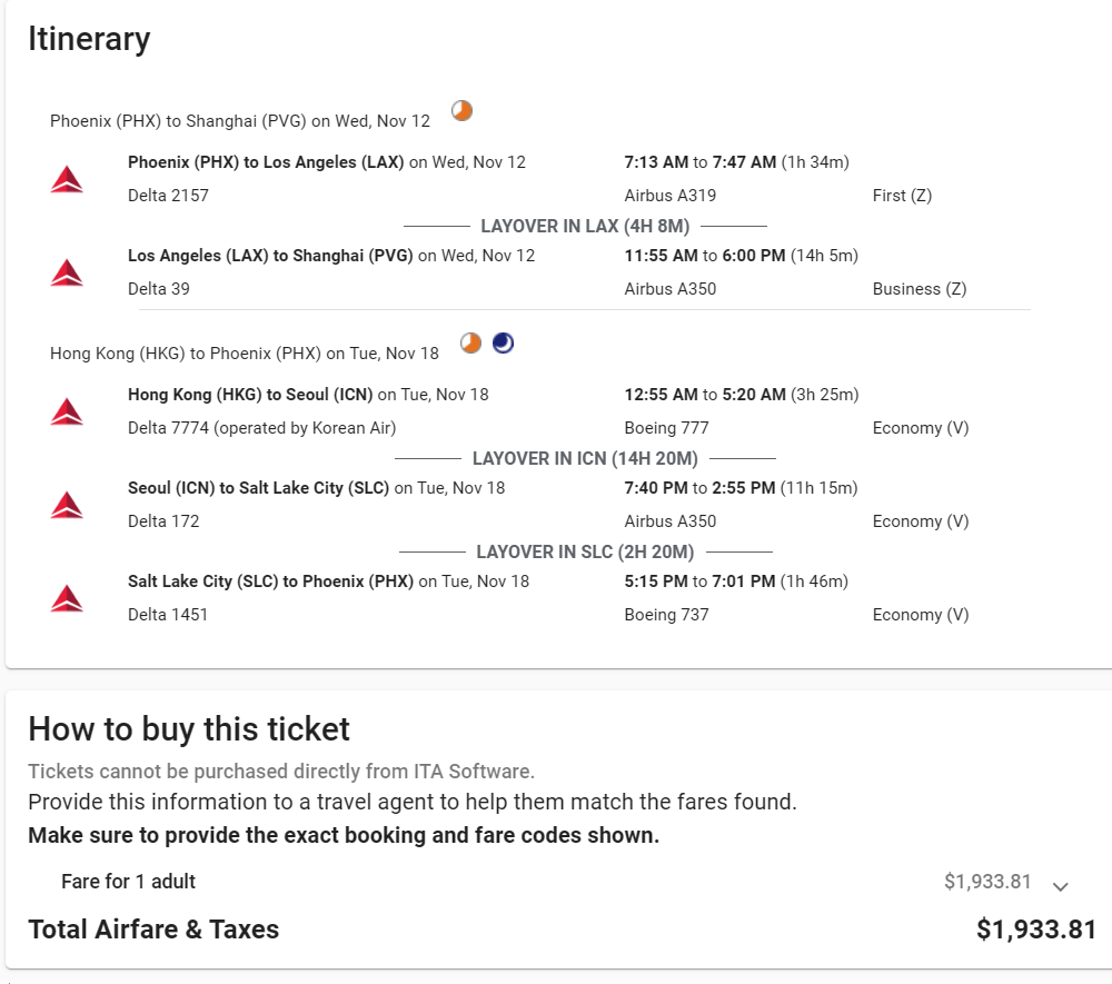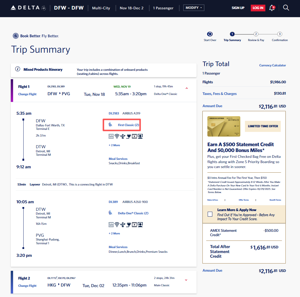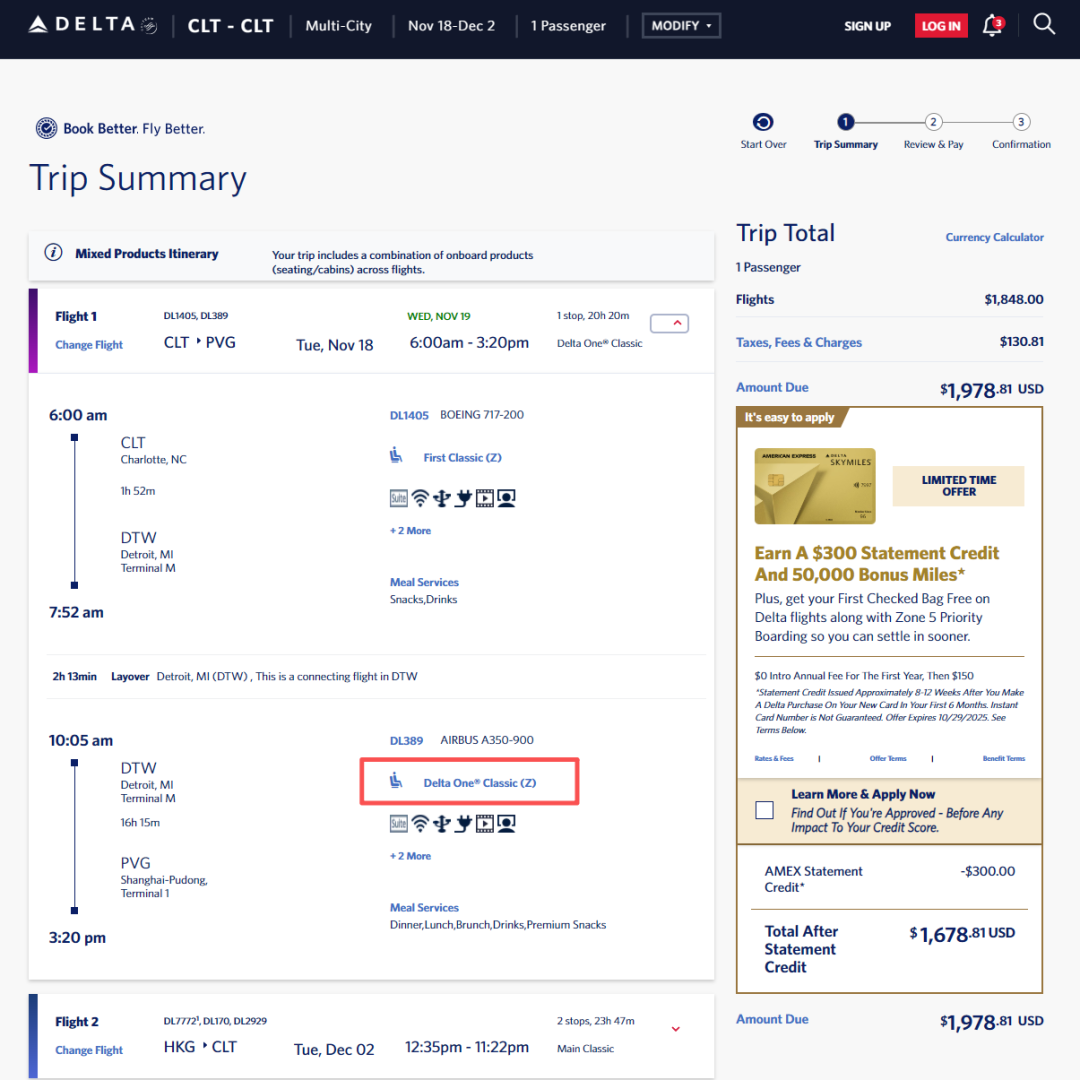 3)这张票在达美官网可以出,也建议在达美官网出~ 因为可以用上delta 礼卡、AMEX offer(如有)、delta ecredit等。但达美官网有个问题:经常只能出自己的代码共享的航班,这会导致价格上涨。此时,可考虑联系达美电话客服通过报航班号的方式订票。
