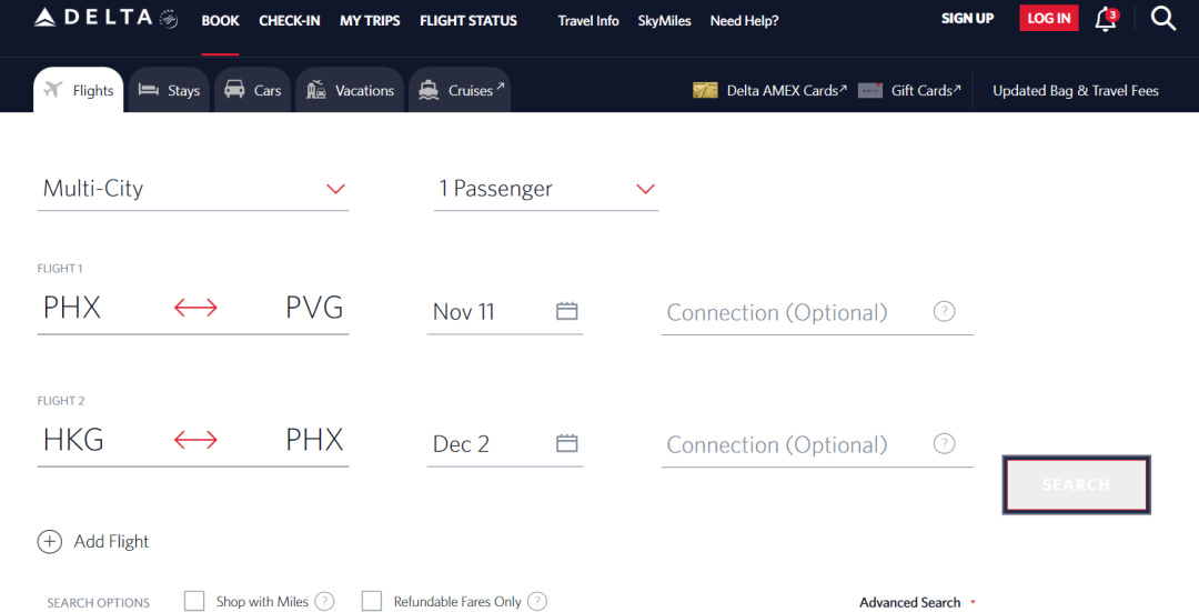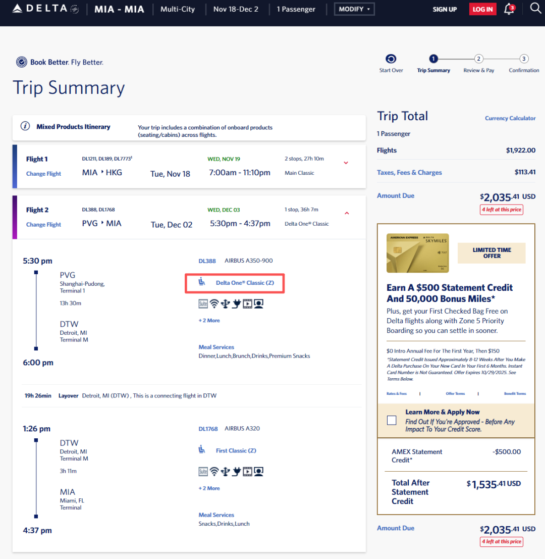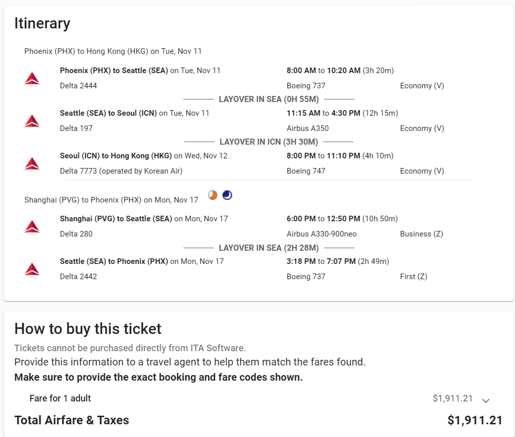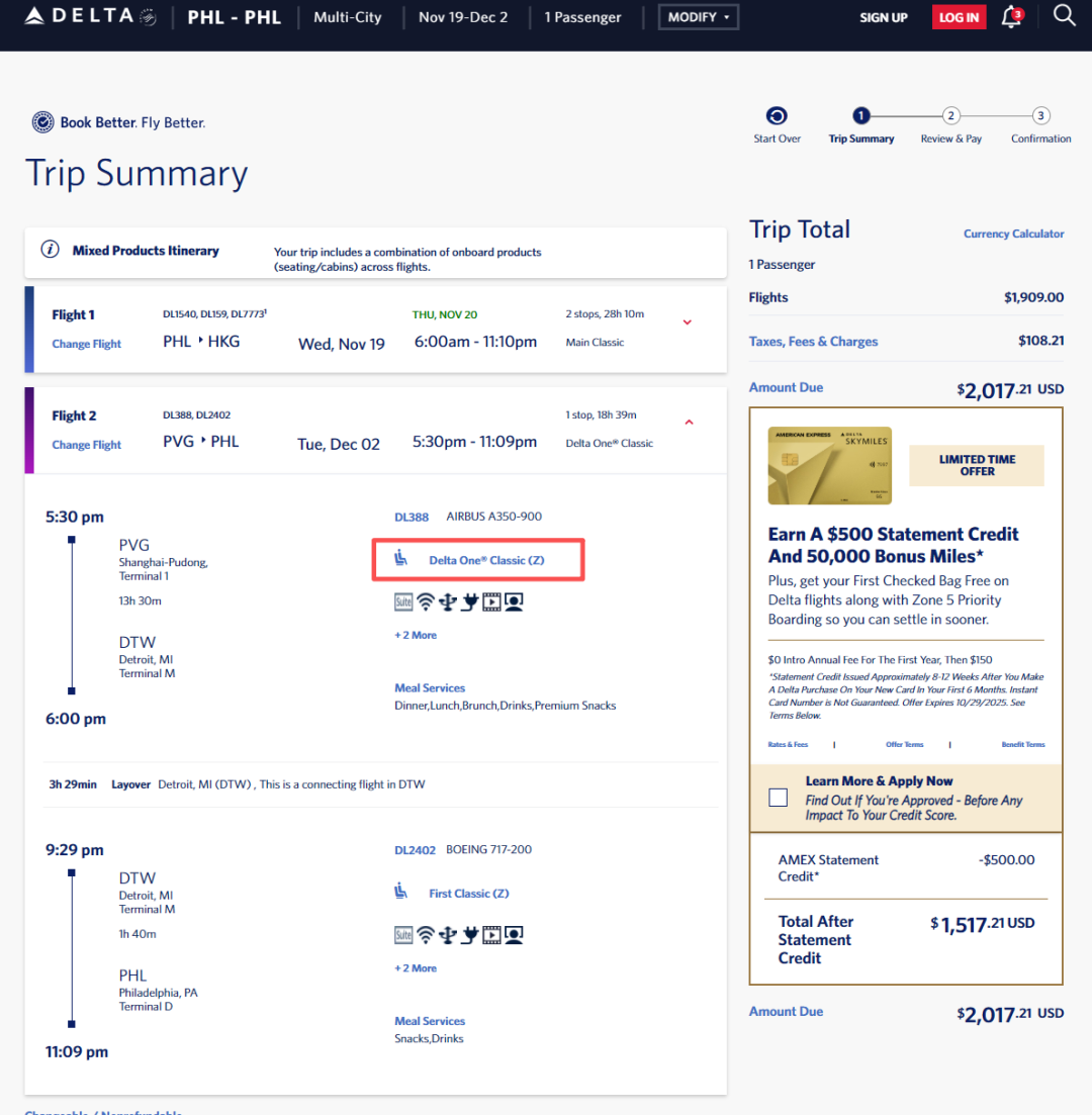 3)这张票在达美官网可以出,也建议在达美官网出~ 因为可以用上delta 礼卡、AMEX offer(如有)、delta ecredit等。但达美官网有个问题:经常只能出自己的代码共享的航班,这会导致价格上涨。此时,可考虑联系达美电话客服通过报航班号的方式订票。